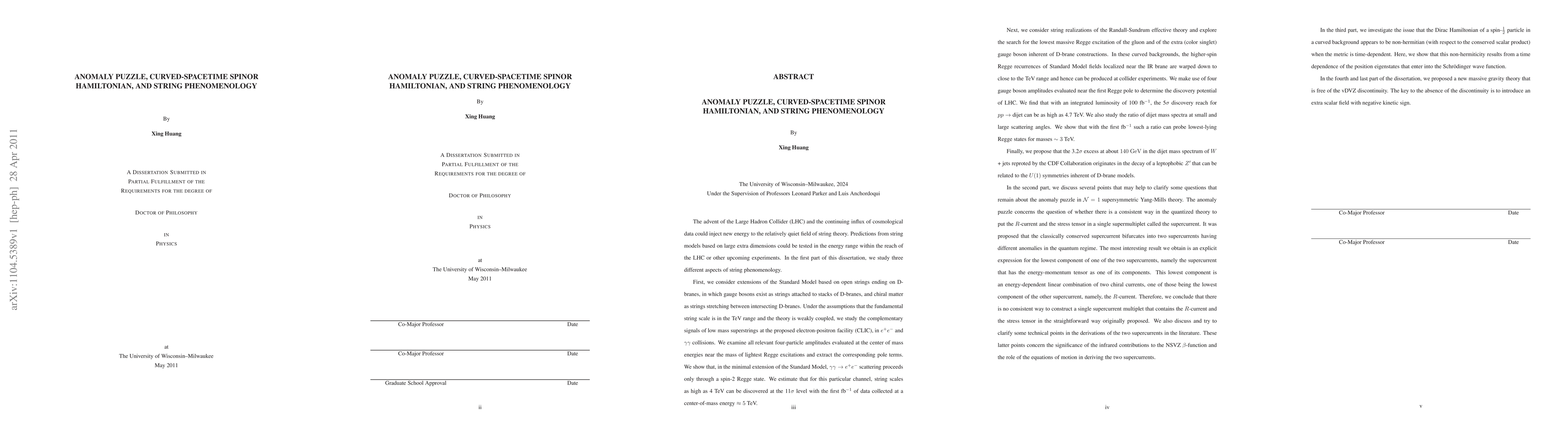 In the first part of this dissertation, we study two different aspects of string phenomenology. First we discuss the complementary signals of low mass superstrings at the proposed electron-positron facilities (ILC and CLIC), in e+e- and {\gamma} {\gamma} collisions. We examine all relevant four-particle amplitudes evaluated at the center of mass energies near the mass of lightest Regge excitations and extract the corresponding pole terms. Secondly, we consider string realizations of the Randall-Sundrum effective theory and explore the search for the lowest massive Regge excitation of the gluon and of the extra (color singlet) gauge boson inherent of D-brane constructions. We also study the ratio of dijet mass spectra at small and large scattering angles. We show that with the first fb-1 such a ratio can probe lowest-lying Regge states for masses ~3.0 TeV. Finally, we propose that the 3.2$\sigma$ excess at about $140 {\rm GeV}$ in the dijet mass spectrum of $W$ + jets reproted by the CDF Collaboration originates in the decay of a leptophobic $Z'$ that can be related to the U(1) symmetries inherent of D-brane models. In the remaining parts of this dissertation, we discuss several points that may help to clarify some questions that remain about the anomaly puzzle in N=1 supersymmetric Yang-Mills theory and we investigate the issue that the Dirac Hamiltonian of a spin-1/2 particle in a curved background appears to be non-hermitian.