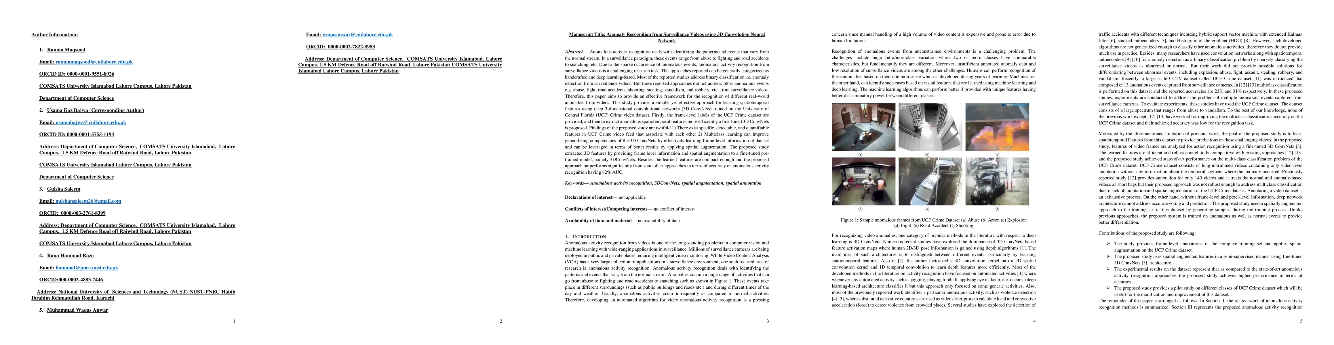 This paper proposes a framework for recognizing various anomalous activities in surveillance videos using 3D convolutional neural networks (3D ConvNets). The study demonstrates that 3D ConvNets can effectively learn spatiotemporal features and improve multiclass learning for better detection of events like abuse, fighting, and theft.