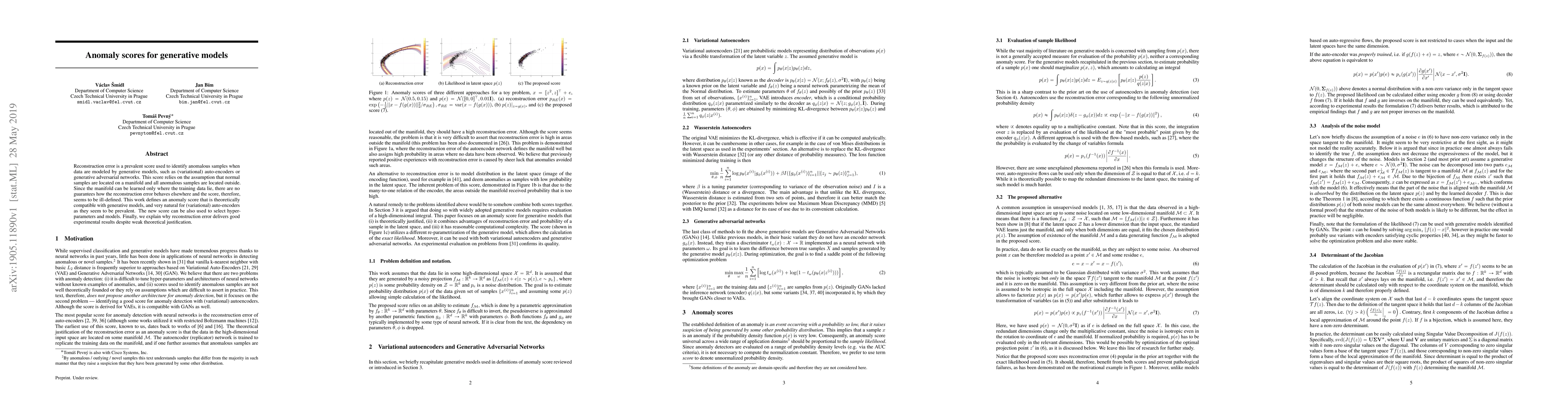 Reconstruction error is a prevalent score used to identify anomalous samples when data are modeled by generative models, such as (variational) auto-encoders or generative adversarial networks. This score relies on the assumption that normal samples are located on a manifold and all anomalous samples are located outside. Since the manifold can be learned only where the training data lie, there are no guarantees how the reconstruction error behaves elsewhere and the score, therefore, seems to be ill-defined. This work defines an anomaly score that is theoretically compatible with generative models, and very natural for (variational) auto-encoders as they seem to be prevalent. The new score can be also used to select hyper-parameters and models. Finally, we explain why reconstruction error delivers good experimental results despite weak theoretical justification.