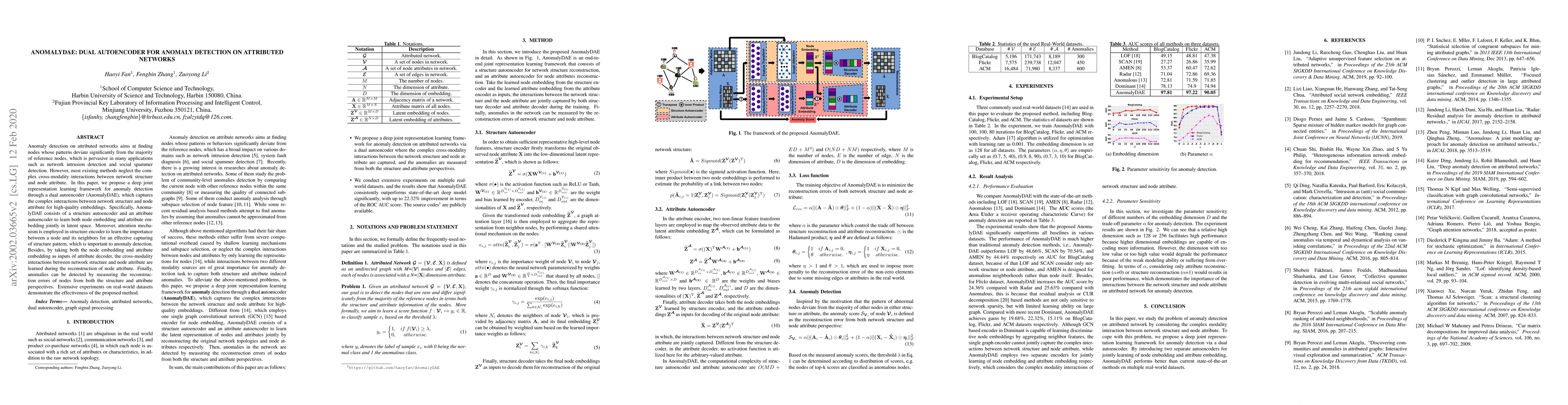 The paper proposes AnomalyDAE, a dual autoencoder framework for anomaly detection in attributed networks, which captures complex interactions between network structure and node attributes through joint representation learning. The method uses an attention mechanism to enhance structure pattern recognition and reconstructs node attributes to detect anomalies based on reconstruction errors.