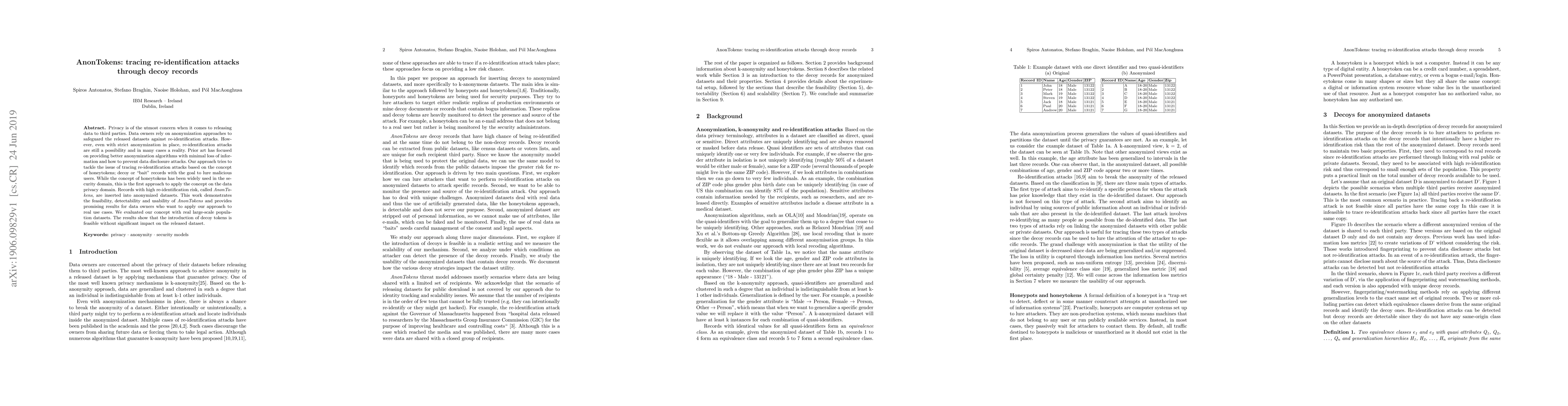 This paper introduces AnonTokens, decoy records embedded in anonymized datasets to detect re-identification attacks. The study demonstrates the feasibility and effectiveness of this approach, showing that it can be implemented without significant impact on data utility, based on evaluations using large-scale population datasets.