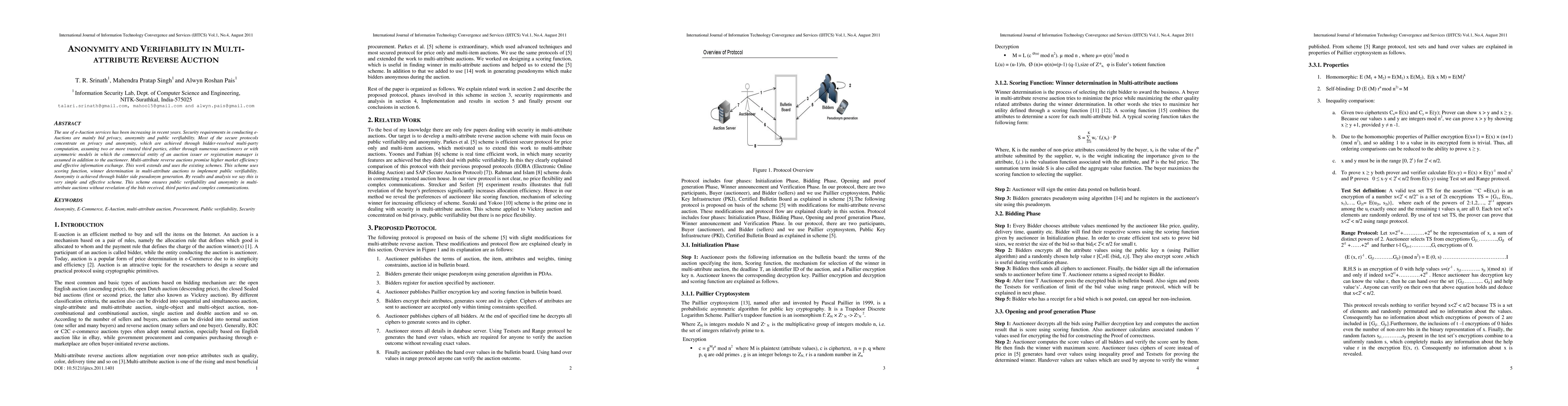 The use of e-Auction services has been increasing in recent years. Security requirements in conducting e-Auctions are mainly bid privacy, anonymity and public verifiability. Most of the secure protocols concentrate on privacy and anonymity, which are achieved through bidder-resolved multi-party computation, assuming two or more trusted third parties, either through numerous auctioneers or with asymmetric models in which the commercial entity of an auction issuer or registration manager is assumed in addition to the auctioneer. Multi-attribute reverse auctions promise higher market efficiency and effective information exchange. This work extends and uses the existing schemes. This scheme uses scoring function, winner determination in multi-attribute auctions to implement public verifiability. Anonymity is achieved through bidder side pseudonym generation. By results and analysis we say this is very simple and effective scheme. This scheme ensures public verifiability and anonymity in multi-attribute auctions without revelation of the bids received, third parties and complex communications.