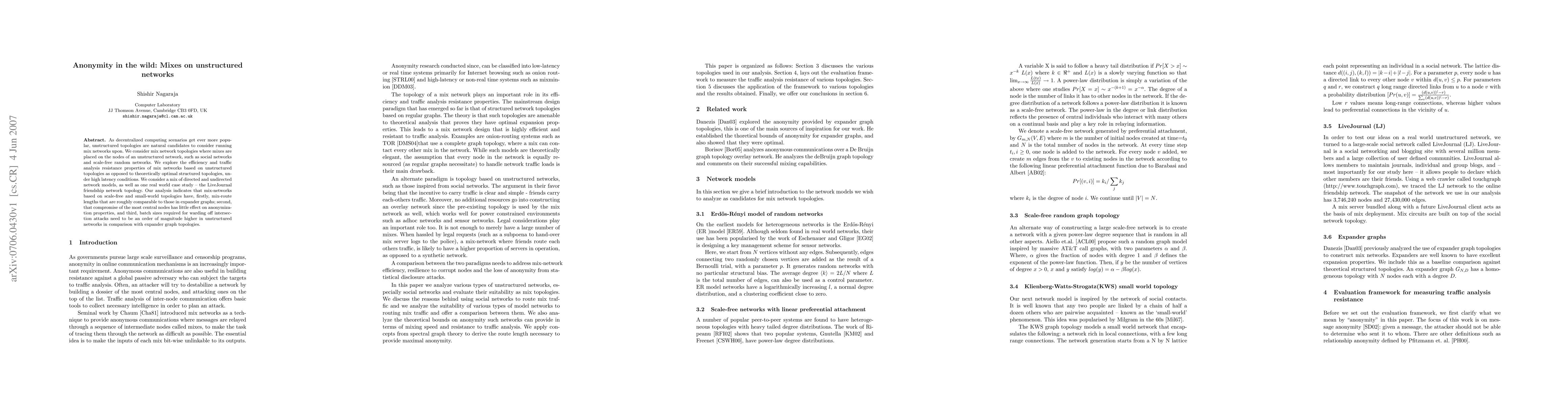 As decentralized computing scenarios get ever more popular, unstructured topologies are natural candidates to consider running mix networks upon. We consider mix network topologies where mixes are placed on the nodes of an unstructured network, such as social networks and scale-free random networks. We explore the efficiency and traffic analysis resistance properties of mix networks based on unstructured topologies as opposed to theoretically optimal structured topologies, under high latency conditions. We consider a mix of directed and undirected network models, as well as one real world case study -- the LiveJournal friendship network topology. Our analysis indicates that mix-networks based on scale-free and small-world topologies have, firstly, mix-route lengths that are roughly comparable to those in expander graphs; second, that compromise of the most central nodes has little effect on anonymization properties, and third, batch sizes required for warding off intersection attacks need to be an order of magnitude higher in unstructured networks in comparison with expander graph topologies.