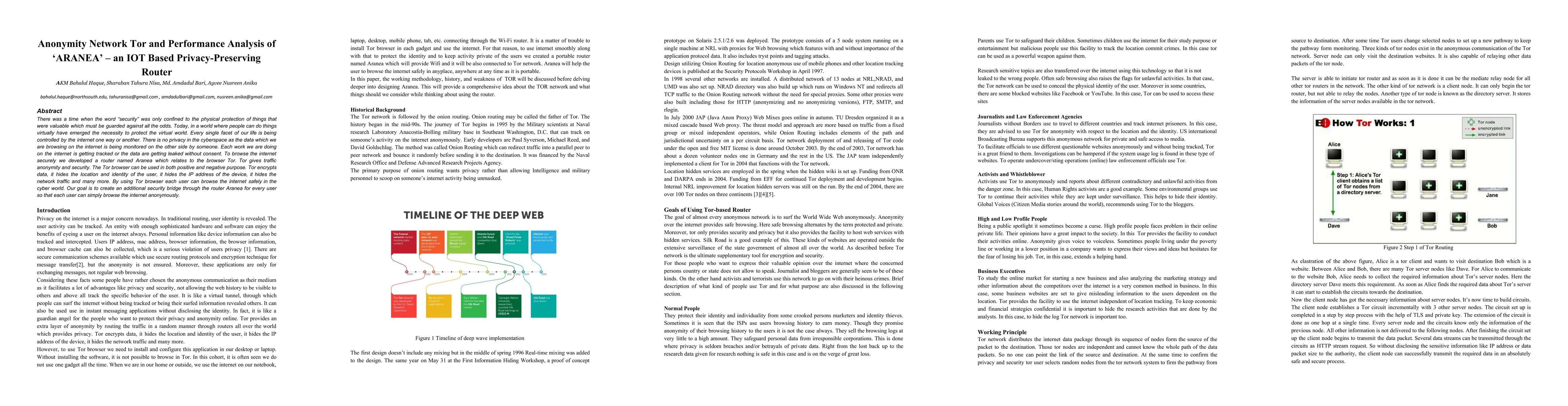 There was a time when the word security was only confined to the physical protection of things that were valuable which must be guarded against all the odds. Today, in a world where people can do things virtually have emerged the necessity to protect the virtual world. Every single facet of our life is being controlled by the internet one way or another. There is no privacy in the cyberspace as the data which we are browsing on the internet is being monitored on the other side by someone. Each work we are doing on the internet is getting tracked or the data are getting leaked without consent. To browse the internet securely we developed a router named Aranea which relates to the browser Tor. Tor gives traffic anonymity and security. The Tor browser can be used in both positive and negative purpose. Tor encrypts data, it hides the location and identity of the user, it hides the IP address of the device, it hides the network traffic and many more. By using Tor browser each user can browse the internet safely in the cyber world. Our goal is to create an additional security bridge through the router Aranea for every user so that each user can simply browse the internet anonymously.