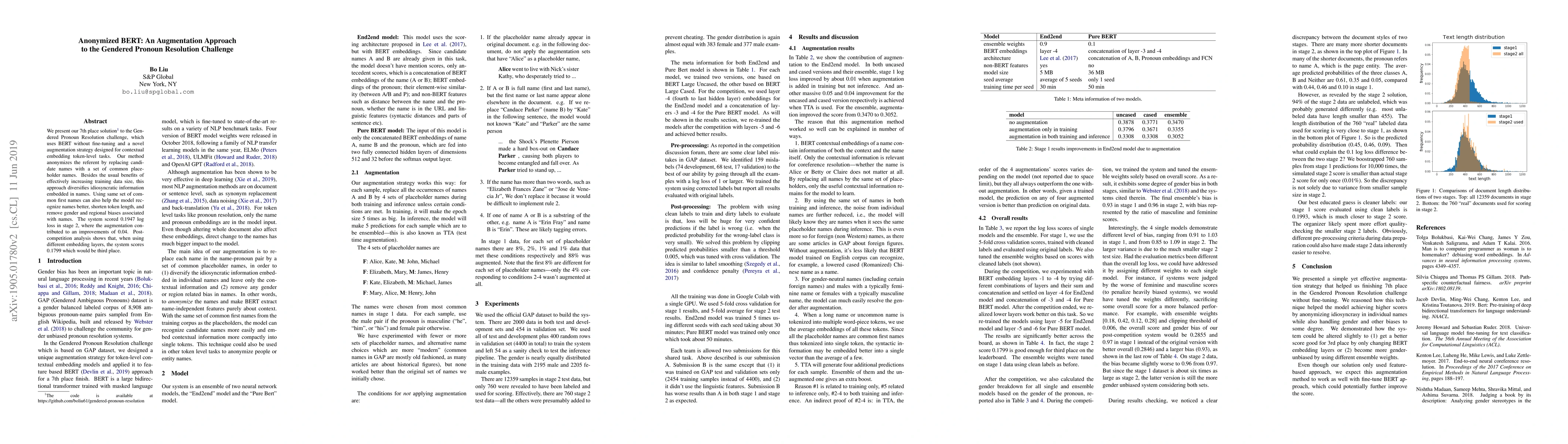 This paper proposes an anonymized BERT approach for the Gendered Pronoun Resolution challenge, using a novel augmentation strategy that replaces names with common placeholders to diversify training data and reduce biases. The anonymized BERT model achieved a 0.1947 log loss in stage 2, with augmentation contributing to a 0.04 improvement.