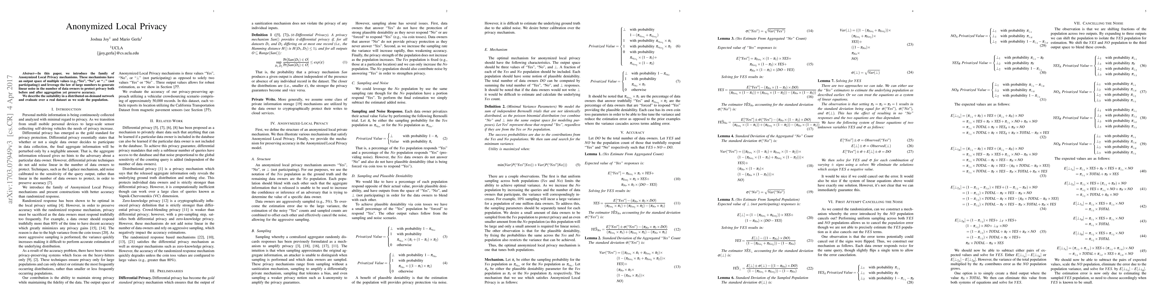 The paper introduces Anonymized Local Privacy mechanisms with an output space of 'Yes', 'No', or '$\perp$' (not participating), leveraging the law of large numbers to add linear noise proportional to the number of data owners for privacy protection both before and after aggregation, while preserving accuracy.