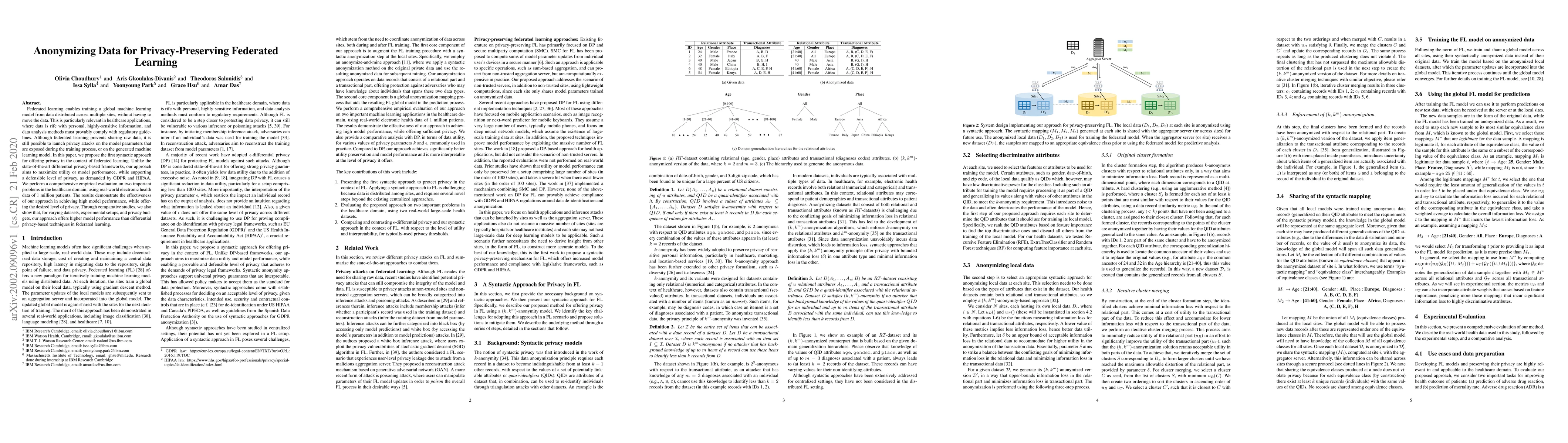 This paper introduces a novel syntactic method for anonymizing data in federated learning to protect privacy while maintaining model performance, especially in healthcare. Empirical evaluations on a large dataset demonstrate its effectiveness in achieving both high utility and privacy compliance compared to differential privacy techniques.