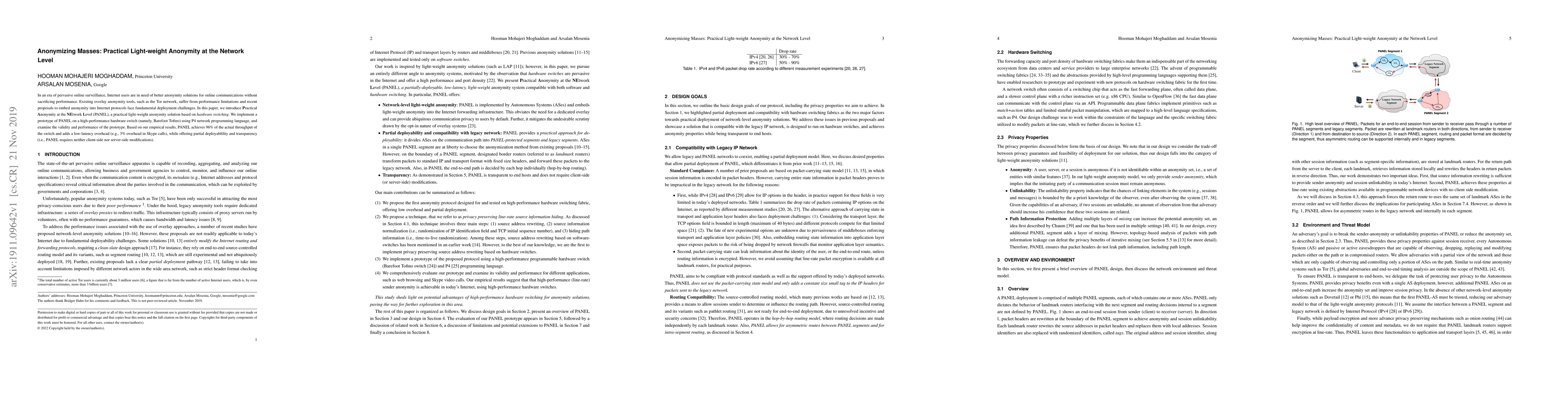 This paper introduces PANEL, a light-weight anonymity solution for network-level communications, leveraging hardware switching to enhance user privacy without significant performance loss. The prototype, implemented on a high-performance switch using P4 language, achieves 96% of the switch's throughput with minimal latency overhead, offering a practical alternative to existing anonymity tools.