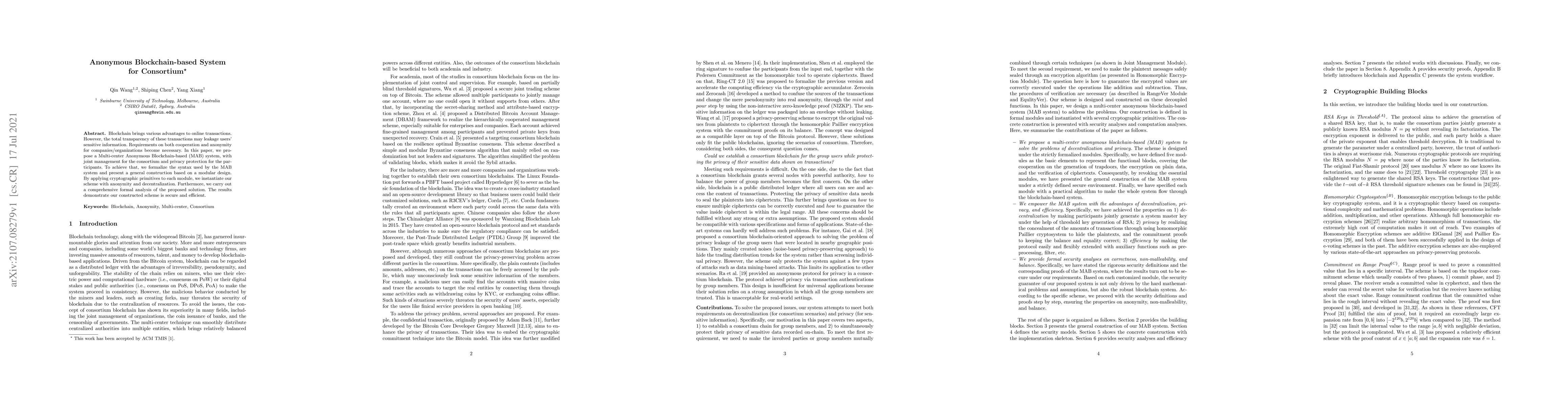 This paper proposes a Multi-center Anonymous Blockchain-based (MAB) system for consortiums that ensures both cooperation and anonymity. The system uses cryptographic primitives to achieve privacy protection while maintaining decentralization, and formal analysis confirms its security and efficiency.