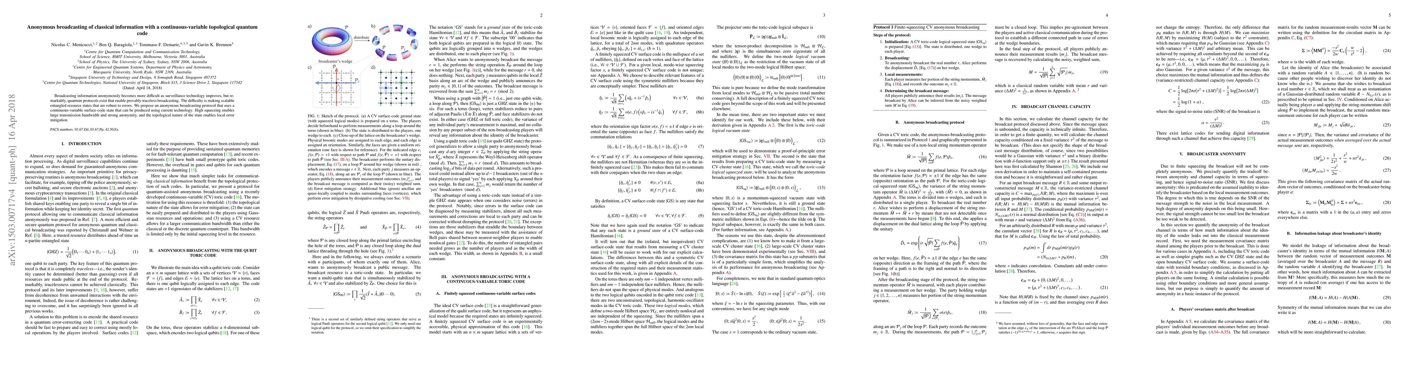 Broadcasting information anonymously becomes more difficult as surveillance technology improves, but remarkably, quantum protocols exist that enable provably traceless broadcasting. The difficulty is making scalable entangled resource states that are robust to errors. We propose an anonymous broadcasting protocol that uses a continuous-variable surface-code state that can be produced using current technology. High squeezing enables large transmission bandwidth and strong anonymity, and the topological nature of the state enables local error mitigation.