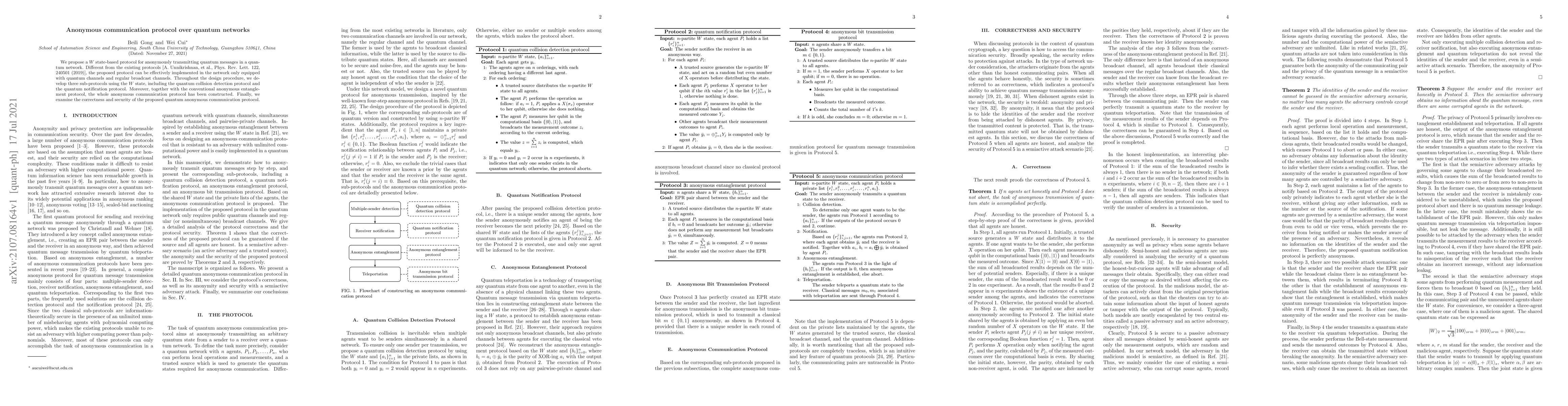 This paper proposes a W state-based protocol for anonymous quantum message transmission over quantum networks, utilizing only quantum channels and broadcast channels. The protocol includes three sub-protocols and ensures correctness and security.