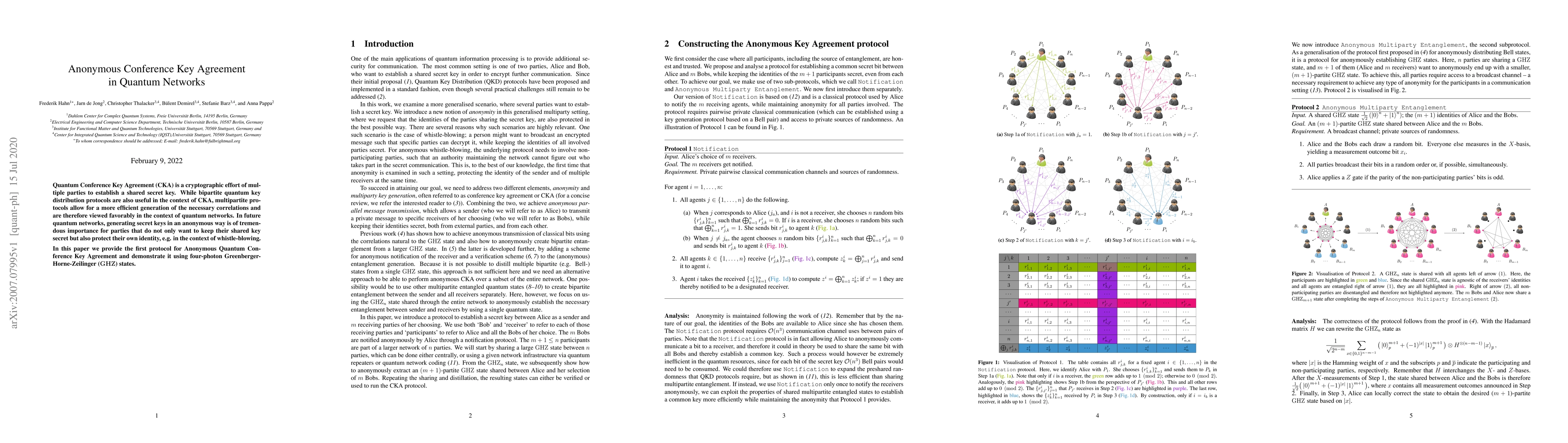 This paper introduces the first protocol for Anonymous Quantum Conference Key Agreement, enabling multiple parties to securely generate a shared secret key without revealing their identities, using four-photon GHZ states to demonstrate the protocol. The focus is on the importance of anonymity in future quantum networks, especially for sensitive communications like whistle-blowing.