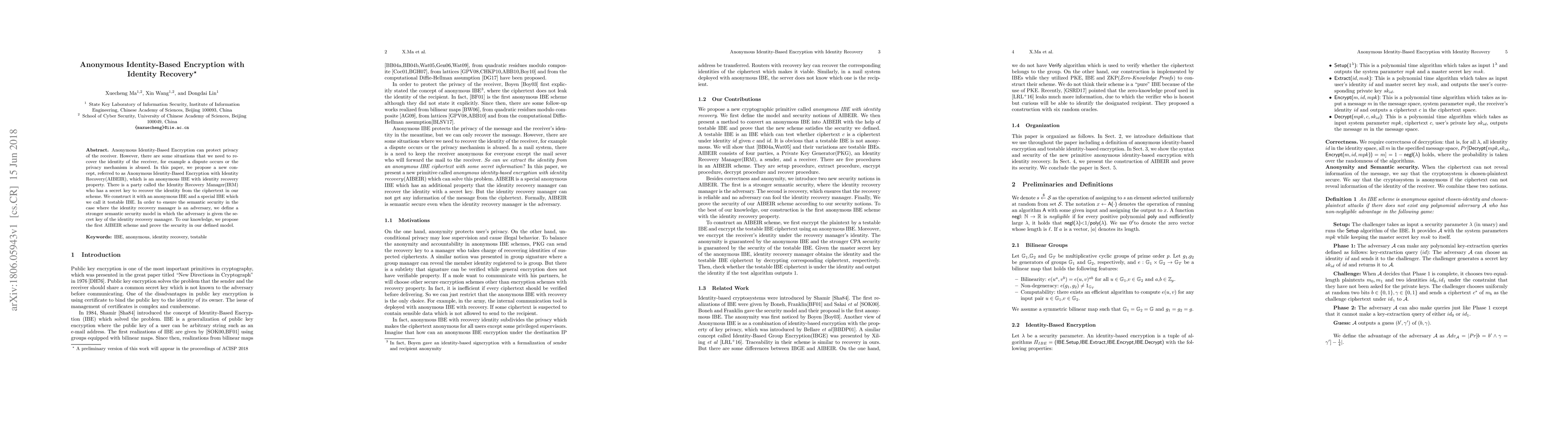 This paper introduces Anonymous Identity-Based Encryption with Identity Recovery (AIBEIR), a scheme allowing for the recovery of receiver identities under certain conditions, such as disputes or privacy abuse. It employs an Identity Recovery Manager with a secret key to retrieve identities from ciphertexts, combining anonymous IBE with a testable IBE, and defines a stronger semantic security model to ensure security even when the recovery manager is adversarial.