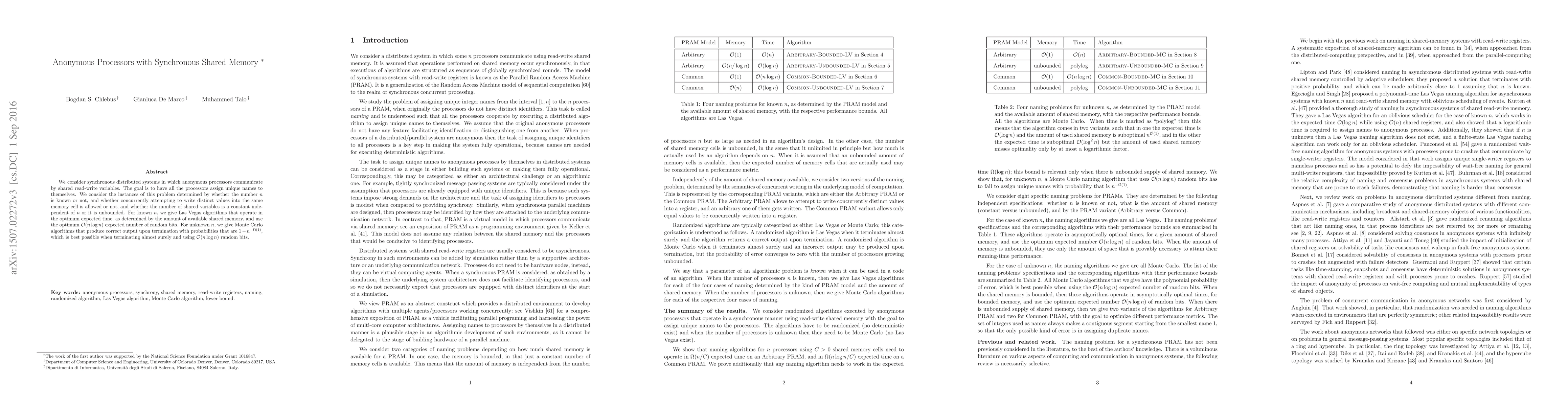 Researchers developed algorithms for anonymous processors to assign unique names, with optimal time and bit usage for known and unknown number of processors. Their solutions use shared memory and random bits.