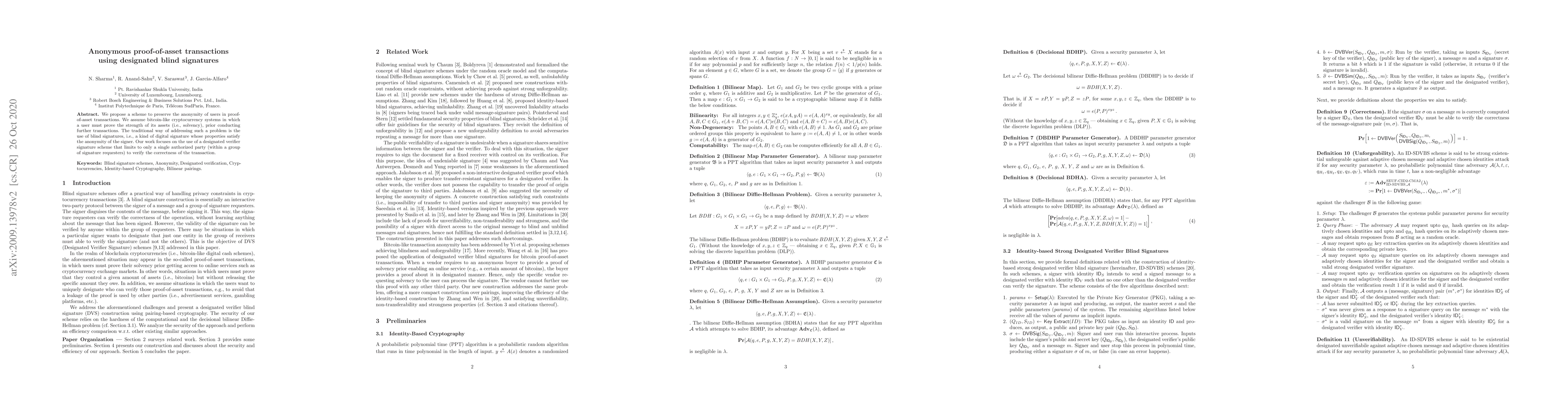 This paper proposes a system to preserve user anonymity in proof-of-asset transactions using designated blind signatures, allowing only authorized parties to verify transactions.