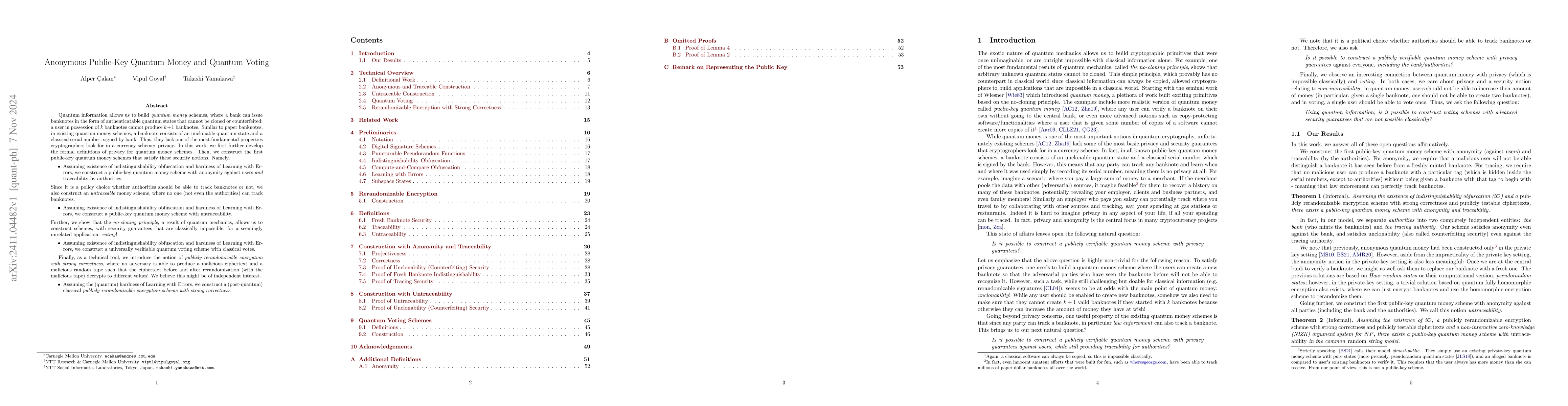 This paper develops the first public-key quantum money schemes that offer anonymity for users and traceability for authorities, leveraging indistinguishability obfuscation and Learning with Errors. It also introduces an untraceable version where no one, including authorities, can track banknotes, and constructs a universally verifiable quantum voting scheme with classical votes, utilizing the no-cloning principle. Additionally, it presents publicly rerandomizable encryption schemes with strong correctness, which may have independent cryptographic interest.