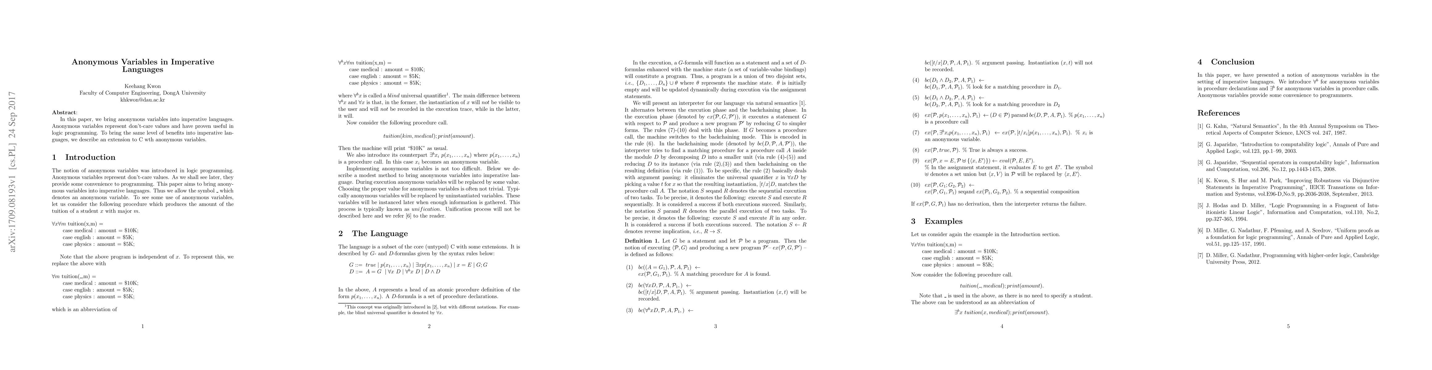 This paper introduces anonymous variables into imperative languages like C, representing don't-care values that enhance flexibility, similar to their utility in logic programming. The authors propose an extension to C that incorporates these variables to improve code expressiveness.