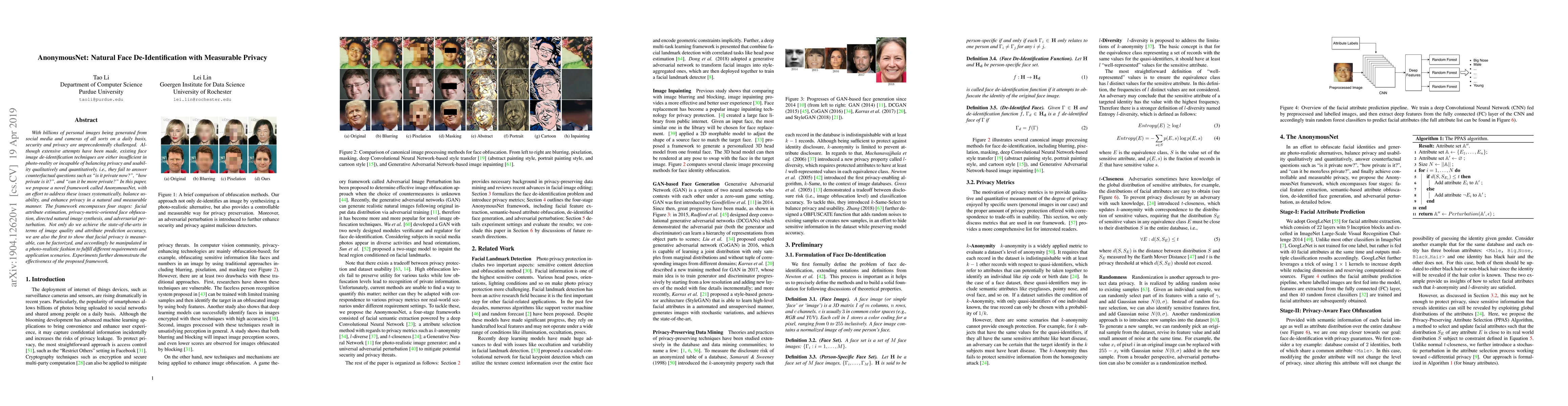 AnonymousNet proposes a novel framework for natural face de-identification that balances usability and privacy, introducing measurable privacy metrics. The framework achieves state-of-the-art results in image quality and attribute prediction while enabling the manipulation of facial privacy in a photo-realistic manner.