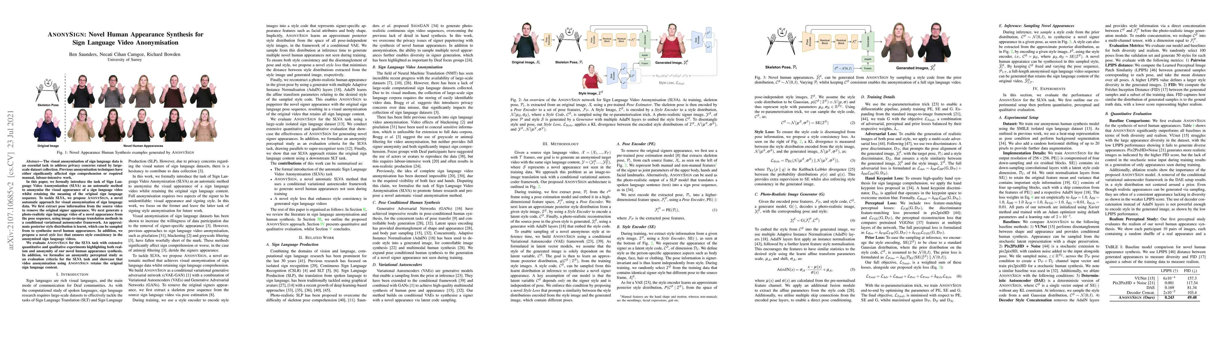 This paper introduces AnonySign, an automatic method for anonymising sign language videos by removing the original signer's appearance while preserving the sign's meaning. It employs pose information extraction and image-to-image translation to generate realistic, anonymised sign language videos, ensuring both anonymity and content integrity through a novel style loss.