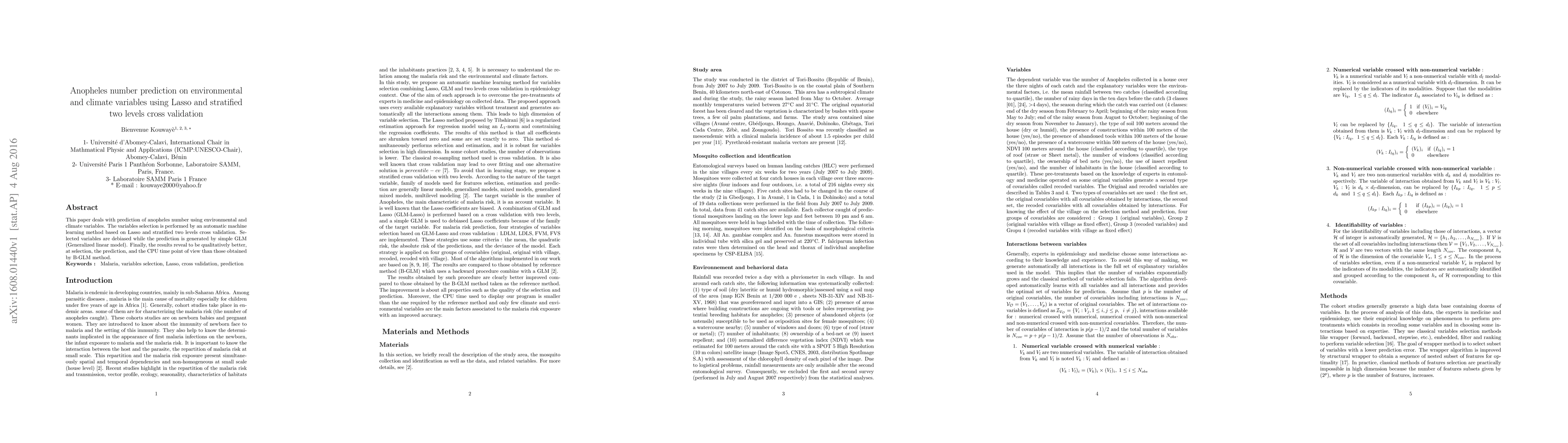 This paper deals with prediction of anopheles number using environmental and climate variables. The variables selection is performed by an automatic machine learning method based on Lasso and stratified two levels cross validation. Selected variables are debiased while the predictionis generated by simple GLM (Generalized linear model). Finally, the results reveal to be qualitatively better, at selection, the prediction,and the CPU time point of view than those obtained by B-GLM method.