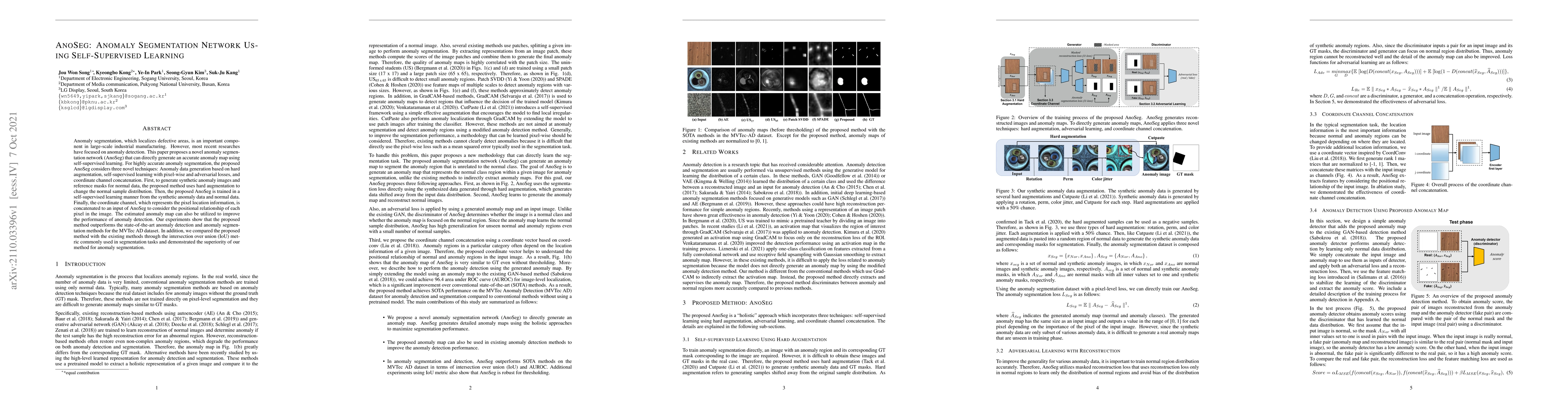 The paper introduces AnoSeg, an anomaly segmentation network utilizing self-supervised learning to generate precise anomaly maps. It employs hard augmentation, self-supervised learning with pixel-wise and adversarial losses, and coordinate channel concatenation to achieve superior segmentation performance, outperforming existing methods on the MVTec AD dataset.