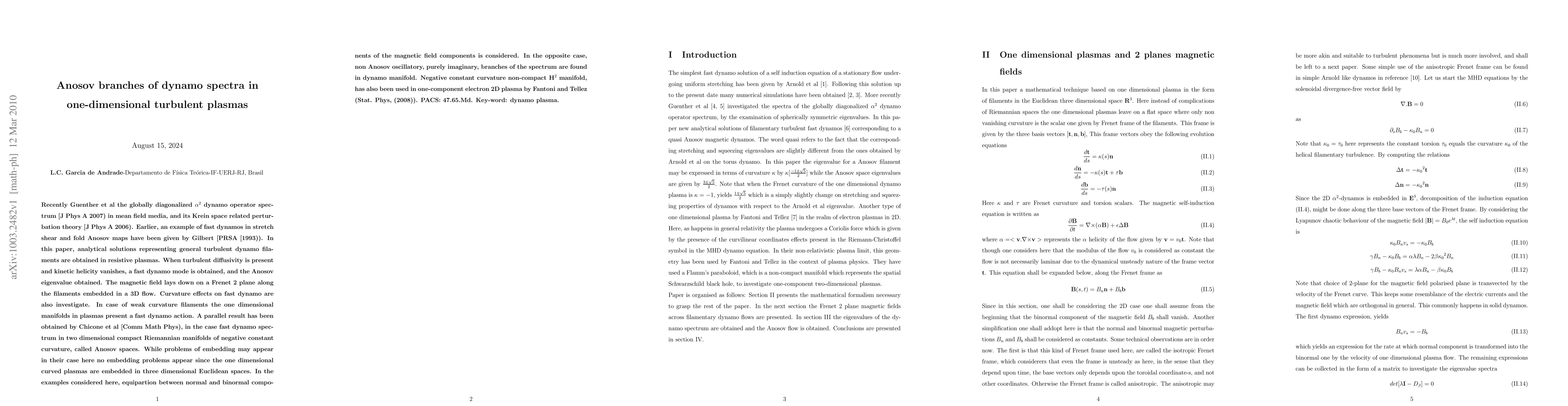 Recently Guenther et al the globally diagonalized ${\alpha}^{2}$ dynamo operator spectrum [J Phys A 2007) in mean field media, and its Krein space related perturbation theory [J Phys A 2006). Earlier, an example of fast dynamos in stretch shear and fold Anosov maps have been given by Gilbert [PRSA [1993)). In this paper, analytical solutions representing general turbulent dynamo filaments are obtained in resistive plasmas. When turbulent diffusivity is present and kinetic helicity vanishes, a fast dynamo mode is obtained, and the Anosov eigenvalue obtained. The magnetic field lays down on a Frenet 2 plane along the filaments embedded in a 3D flow. Curvature effects on fast dynamo are also investigate. In case of weak curvature filaments the one dimensional manifolds in plasmas present a fast dynamo action. A parallel result has been obtained by Chicone et al [Comm Math Phys), in the case fast dynamo spectrum in two dimensional compact Riemannian manifolds of negative constant curvature, called Anosov spaces. While problems of embedding may appear in their case here no embedding problems appear since the one dimensional curved plasmas are embedded in three dimensional Euclidean spaces. In the examples considered here, equipartion between normal and binormal components of the magnetic field components is considered. In the opposite case, non Anosov oscillatory, purely imaginary, branches of the spectrum are found in dynamo manifold. Negative constant curvature non-compact $\textbf{H}^{2}$ manifold, has also been used in one-component electron 2D plasma by Fantoni and Tellez (Stat. Phys, (2008))