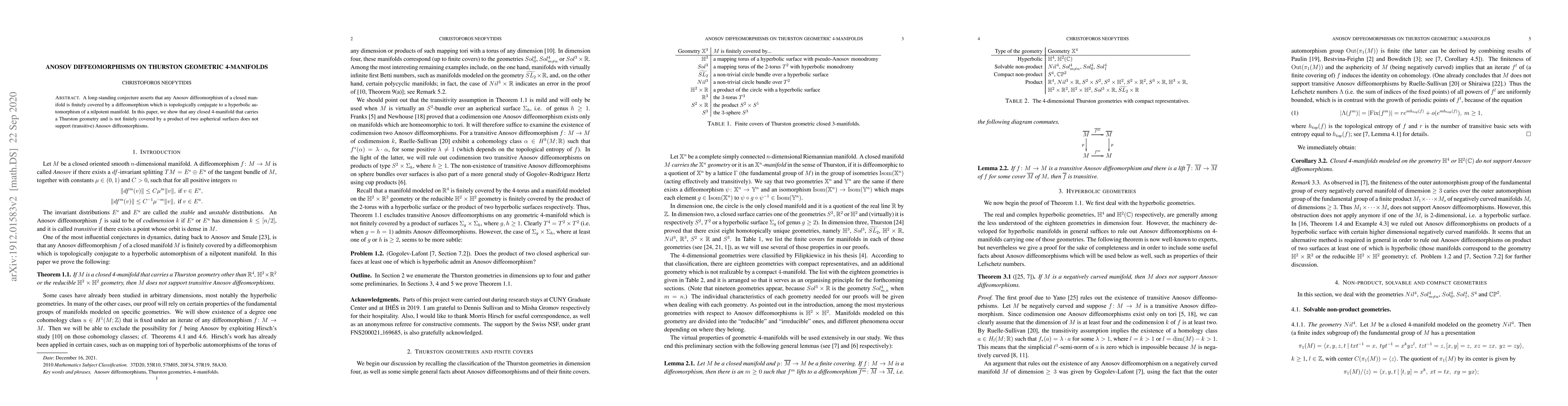 A long-standing conjecture asserts that any Anosov diffeomorphism of a closed manifold is finitely covered by a diffeomorphism which is topologically conjugate to a hyperbolic automorphism of a nilpotent manifold. In this paper, we show that any closed 4-manifold that carries a Thurston geometry and is not finitely covered by a product of two aspherical surfaces does not support (transitive) Anosov diffeomorphisms.