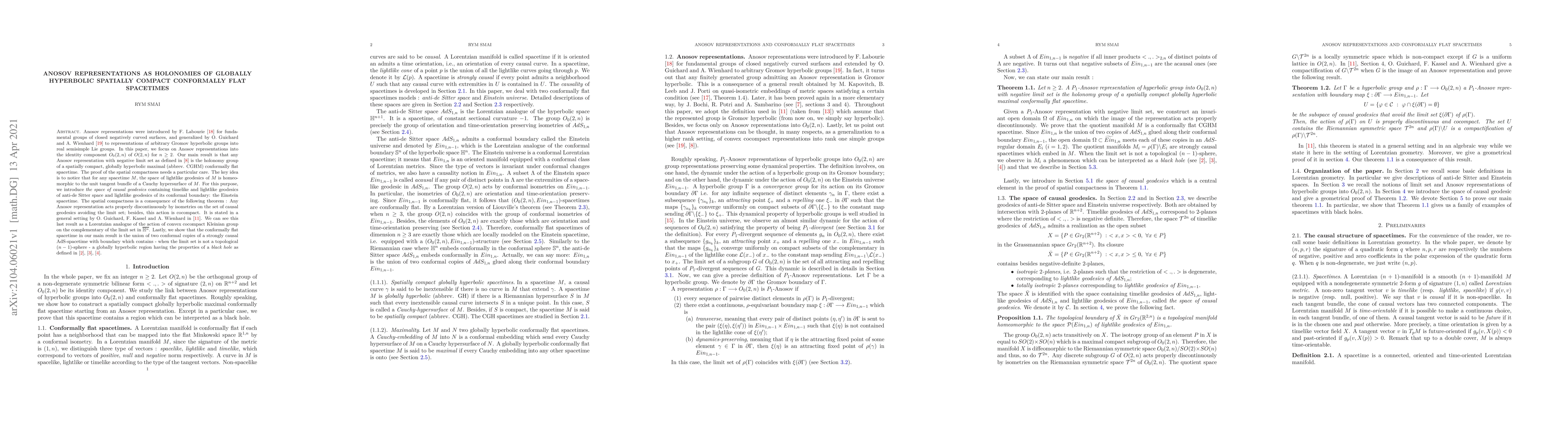 Anosov representations were introduced by F. Labourie [18] for fundamental groups of closed negatively curved surfaces, and generalized by O. Guichard and A. Wienhard [19] to representations of arbitrary Gromov hyperbolic groups into real semisimple Lie groups. In this paper, we focus on Anosov representations into the identity component O0(2, n) of O(2, n) for n $\ge$ 2. Our main result is that any Anosov representation with negative limit set as defined in [8] is the holonomy group of a spatially compact, globally hyperbolic maximal (abbrev. CGHM) conformally flat spacetime. The proof of the spatial compactness needs a particular care. The key idea is to notice that for any spacetime M , the space of lightlike geodesics of M is homeomorphic to the unit tangent bundle of a Cauchy hypersurface of M. For this purpose, we introduce the space of causal geodesics containing timelike and lightlike geodesics of anti-de Sitter space and lightlike geodesics of its conformal boundary: the Einstein spacetime. The spatial compactness is a consequence of the following theorem : Any Anosov representation acts properly discontinuously by isometries on the set of causal geodesics avoiding the limit set; besides, this action is cocompact. It is stated in a general setting by O. Guichard, F. Kassel and A. Wienhard in [11]. We can see this last result as a Lorentzian analogue of the action of convex cocompact Kleinian group on the complementary of the limit set in H n. Lastly, we show that the conformally flat spacetime in our main result is the union of two conformal copies of a strongly causal AdS-spacetime with boundary which contains-when the limit set is not a topological (n -- 1)-sphere-a globally hyperbolic region having the properties of a black hole as defined in [2], [3], [4].
