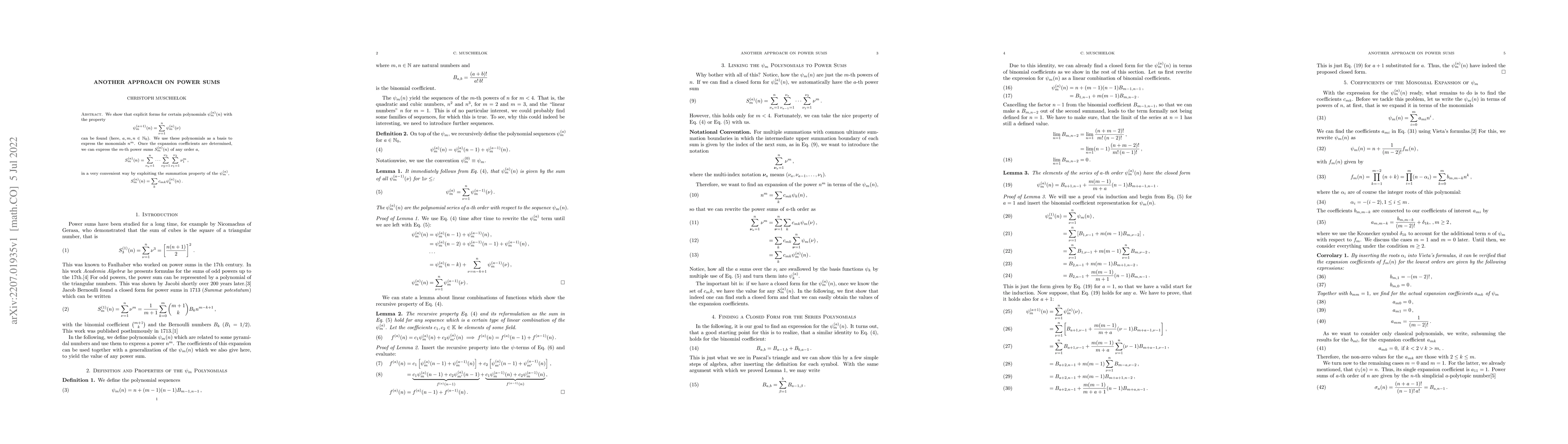 This paper introduces explicit forms for polynomials $\psi^{(a)}_m(n)$ that facilitate the summation of power sums, allowing for the convenient expression of $m$-th power sums $S^{(a)}_m(n)$ through these polynomials. The approach leverages the summation property of $\psi_m^{(a)}$ to simplify the computation of power sums.