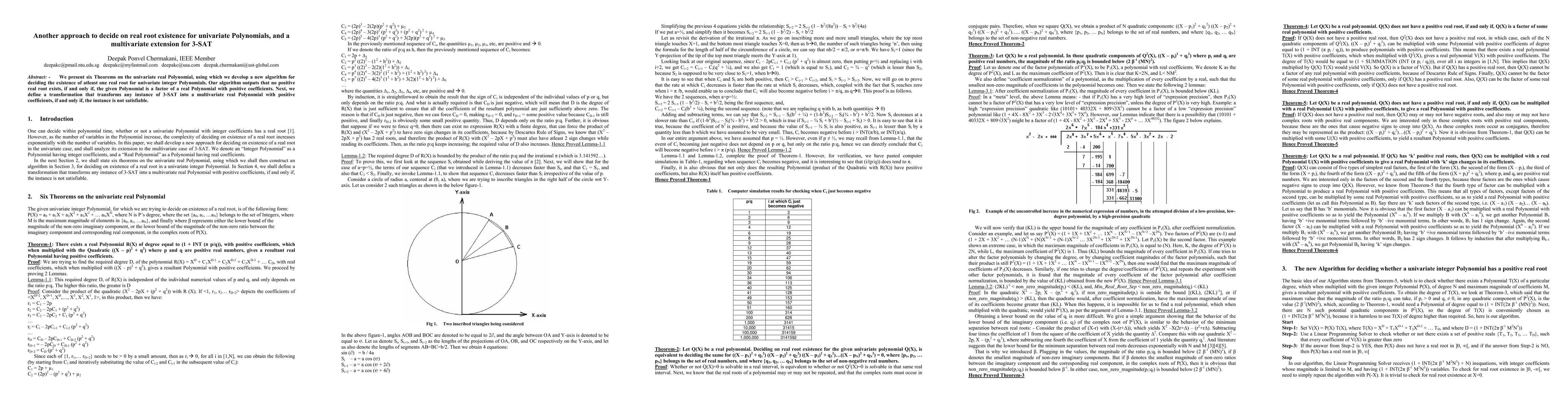 We present six Theorems on the univariate real Polynomial, using which we develop a new algorithm for deciding the existence of atleast one real root for univariate integer Polynomials. Our algorithm outputs that no positive real root exists, if and only if, the given Polynomial is a factor of a real Polynomial with positive coefficients. Next, we define a transformation that transforms any instance of 3-SAT into a multivariate real Polynomial with positive coefficients, if and only if, the instance is not satisfiable.