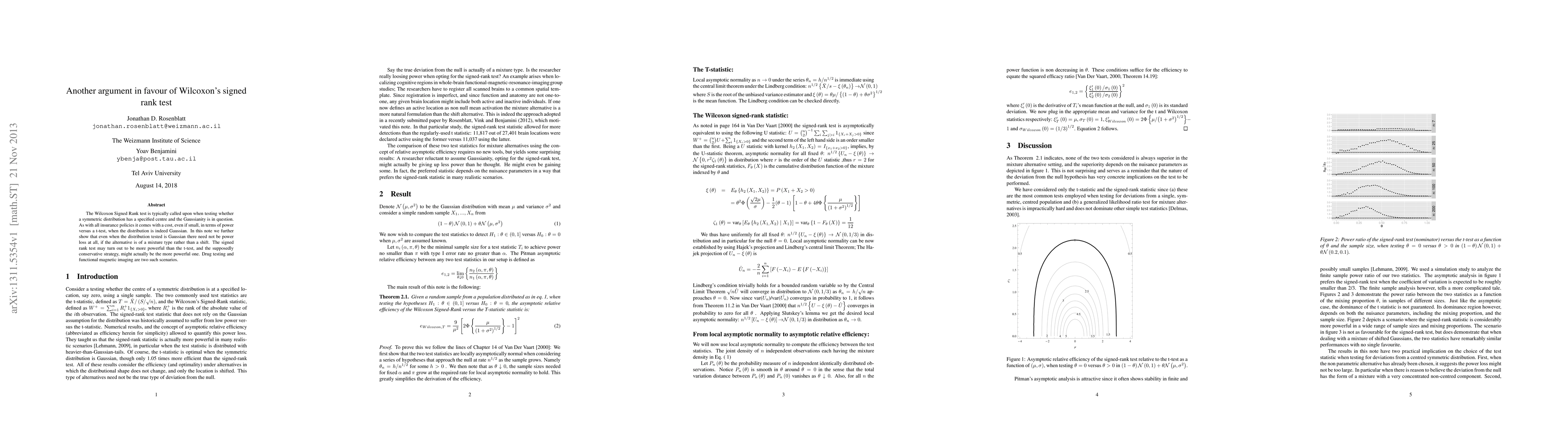 The Wilcoxon Signed Rank test is typically called upon when testing whether a symmetric distribution has a specified centre and the Gaussianity is in question. As with all insurance policies it comes with a cost, even if small, in terms of power versus a t-test, when the distribution is indeed Gaussian. In this note we further show that even when the distribution tested is Gaussian there need not be power loss at all, if the alternative is of a mixture type rather than a shift. The signed rank test may turn out to be more powerful than the t-test, and the supposedly conservative strategy, might actually be the more powerful one. Drug testing and functional magnetic imaging are two such scenarios. Wilcoxon' signed rank test will typically be called upon by a researcher when testing for the location of a single population, using a small sample and Gaussianity is dubious. As all insurance policies, it will come with a cost-- power. It is well known, that under a Gaussian setup, the signed rank test is less powerful than, say, a t-test. The works of Pitman and others have reassured us that this power loss is surprisingly small. In this note we argue that the power loss might actually be smaller than typically assumed. In particular, if the deviation from the null Gaussian distribution is of a mixture type and not a shift type, the signed rank test is no longer dominated by the t-test and can actually be more powerful.