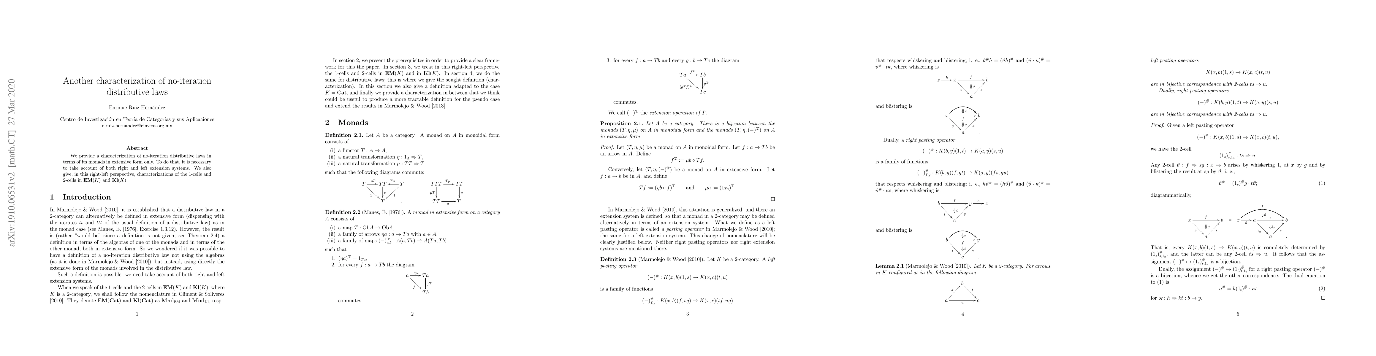 This paper characterizes no-iteration distributive laws using extensive form monads, considering both right and left extension systems. It also provides new insights into 1-cells and 2-cells within the categories $\mathbf{EM}(K)$ and $\mathbf{Kl}(K)$.
