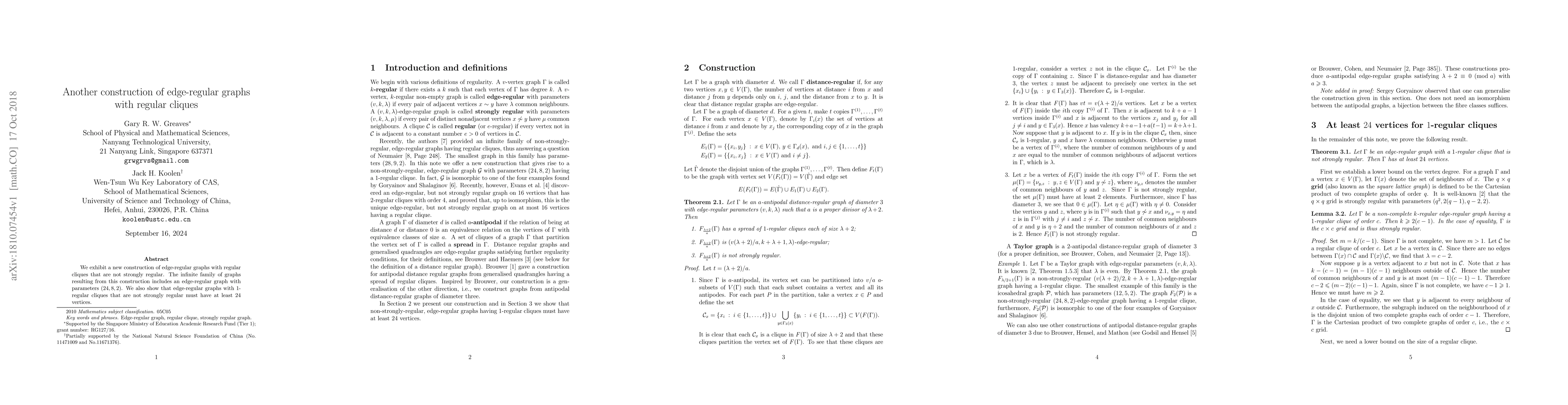 We exhibit a new construction of edge-regular graphs with regular cliques that are not strongly regular. The infinite family of graphs resulting from this construction includes an edge-regular graph with parameters $(24,8,2)$. We also show that edge-regular graphs with $1$-regular cliques that are not strongly regular must have at least $24$ vertices.