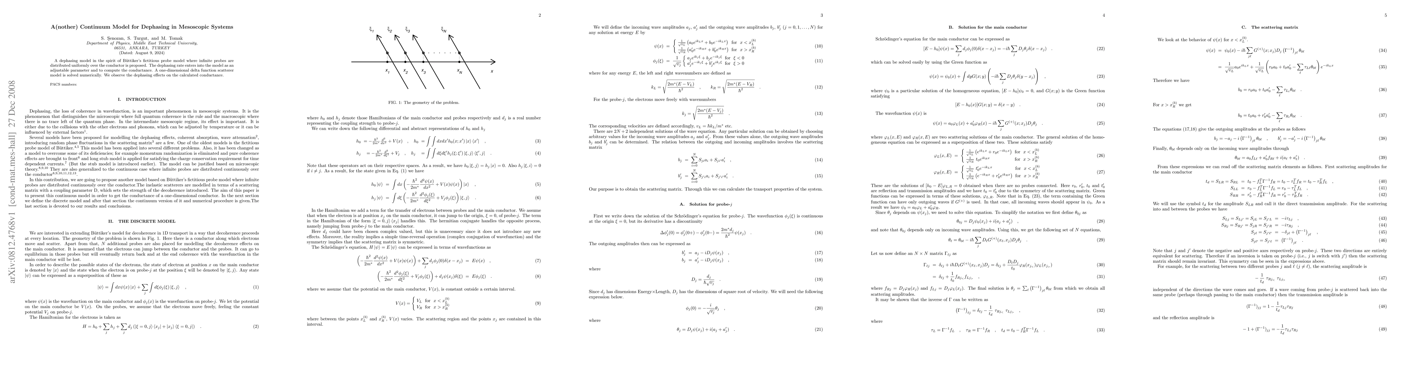 This paper proposes a novel dephasing model in mesoscopic systems, inspired by Buttiker's fictitious probe model. It introduces an adjustable dephasing rate parameter to compute conductance. Through numerical solution of a one-dimensional delta function scatterer model, the paper demonstrates dephasing effects on conductance calculations.