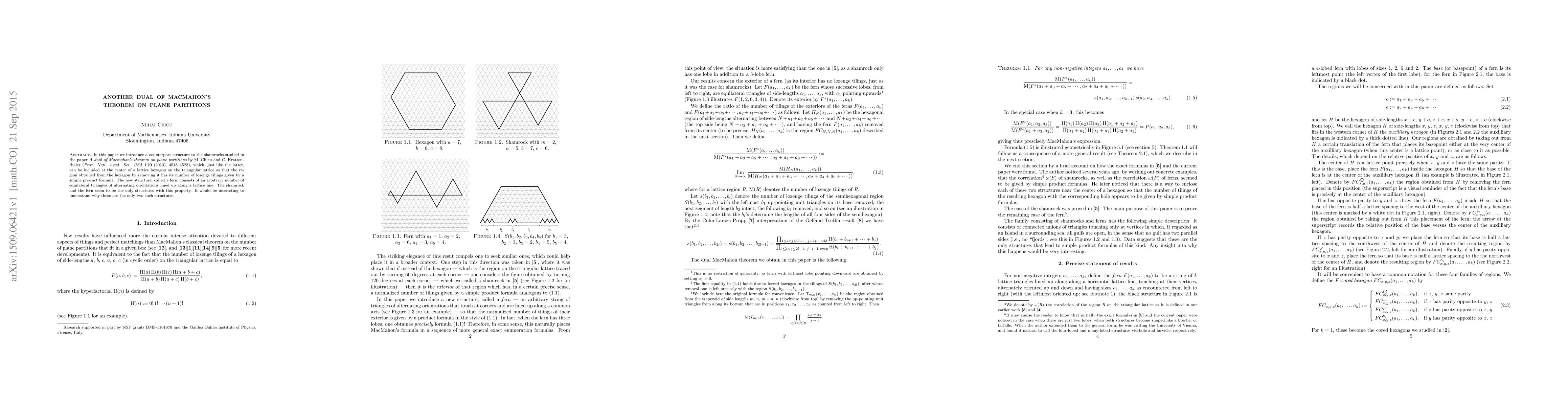 In this paper we introduce a counterpart structure to the shamrocks studied in the paper "A dual of Macmahon's theorem on plane partitions" by M. Ciucu and C. Krattenthaler (Proc. Natl. Acad. Sci. USA, vol. 110 (2013), 4518-4523), which, just like the latter, can be included at the center of a lattice hexagon on the triangular lattice so that the region obtained from the hexagon by removing it has its number of lozenge tilings given by a simple product formula. The new structure, called a fern, consists of an arbitrary number of equilateral triangles of alternating orientations lined up along a lattice line. The shamrock and the fern seem to be the only structures with this property. It would be interesting to understand why these are the only two such structures.