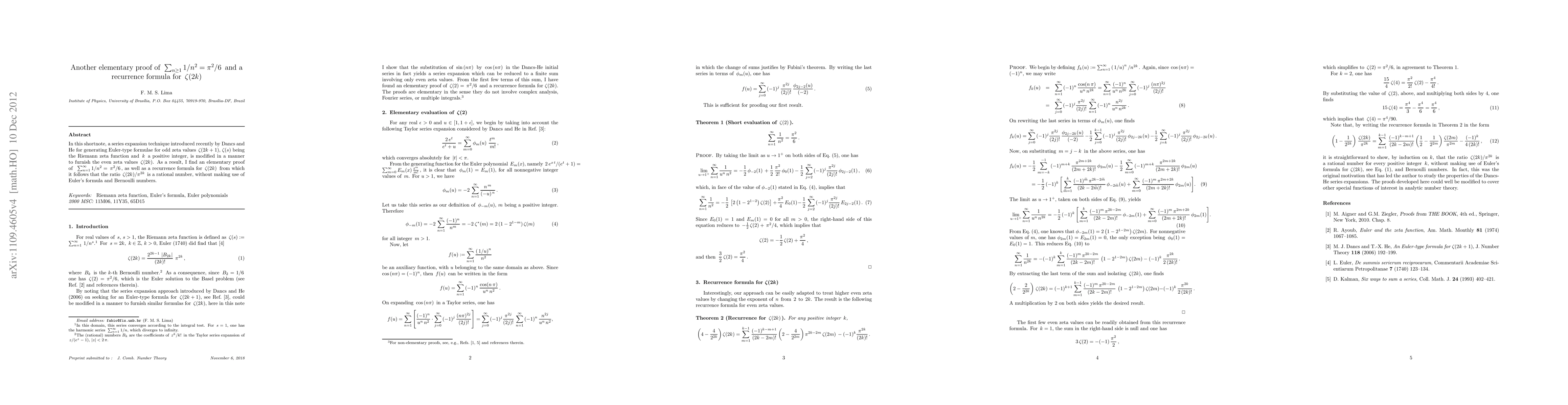 Researchers introduce a modified series expansion technique to derive an elementary proof of the Basel problem (π^2/6) and a recurrence formula for even zeta values, revealing a rational relationship between these values and pi.