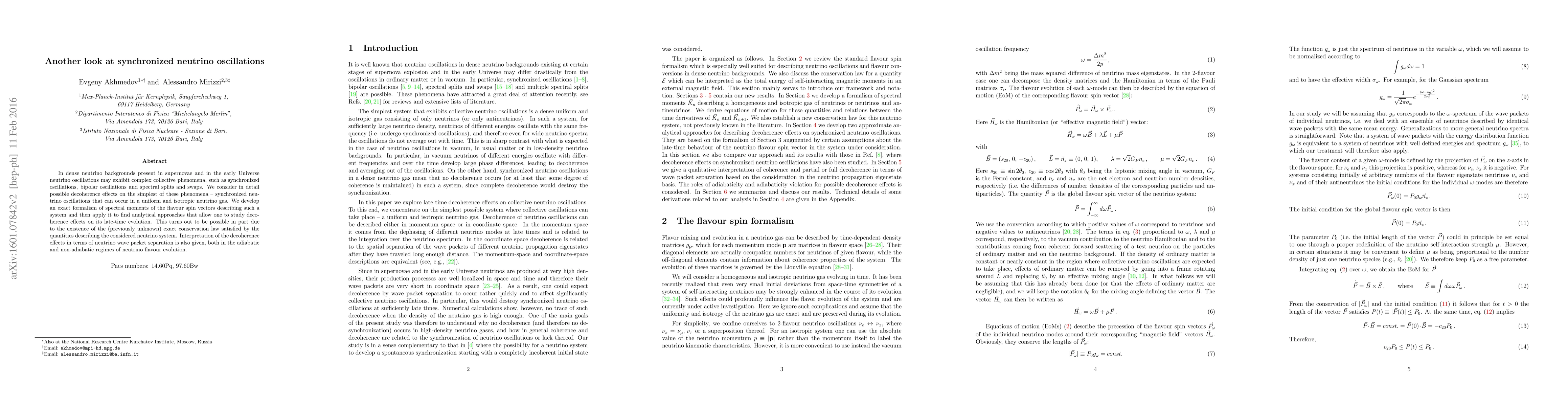 This paper investigates synchronized neutrino oscillations in dense backgrounds, developing a formalism to analyze decoherence effects. It uncovers an exact conservation law and provides analytical methods to study the late-time evolution of these oscillations, interpreting decoherence in terms of neutrino wave packet separation in both adiabatic and non-adiabatic regimes.