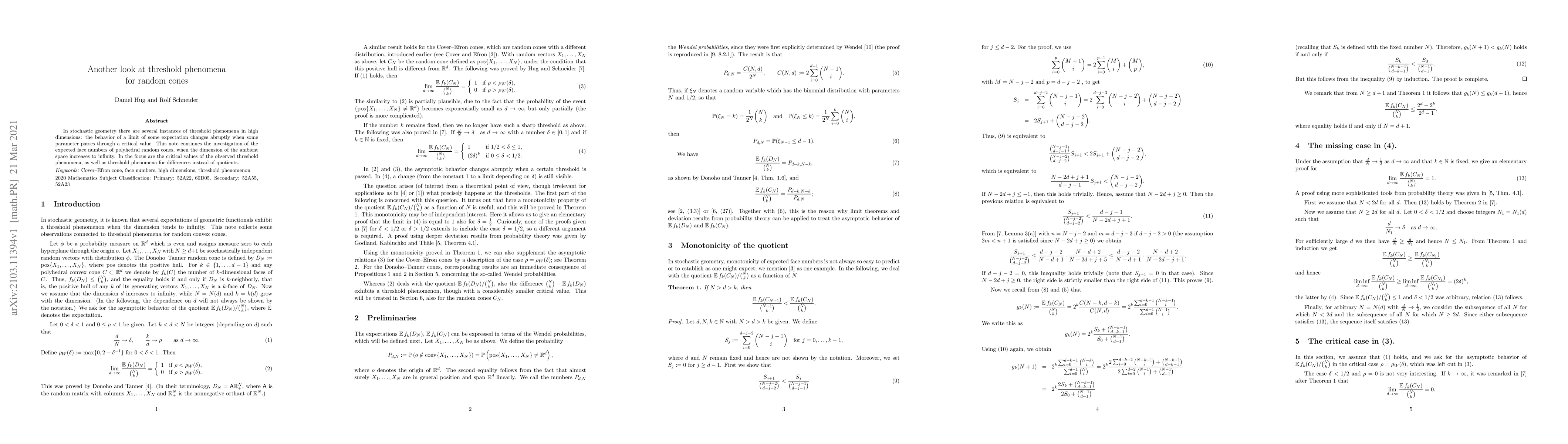 In stochastic geometry there are several instances of threshold phenomena in high dimensions: the behavior of a limit of some expectation changes abruptly when some parameter passes through a critical value. This note continues the investigation of the expected face numbers of polyhedral random cones, when the dimension of the ambient space increases to infinity. In the focus are the critical values of the observed threshold phenomena, as well as threshold phenomena for differences instead of quotients.