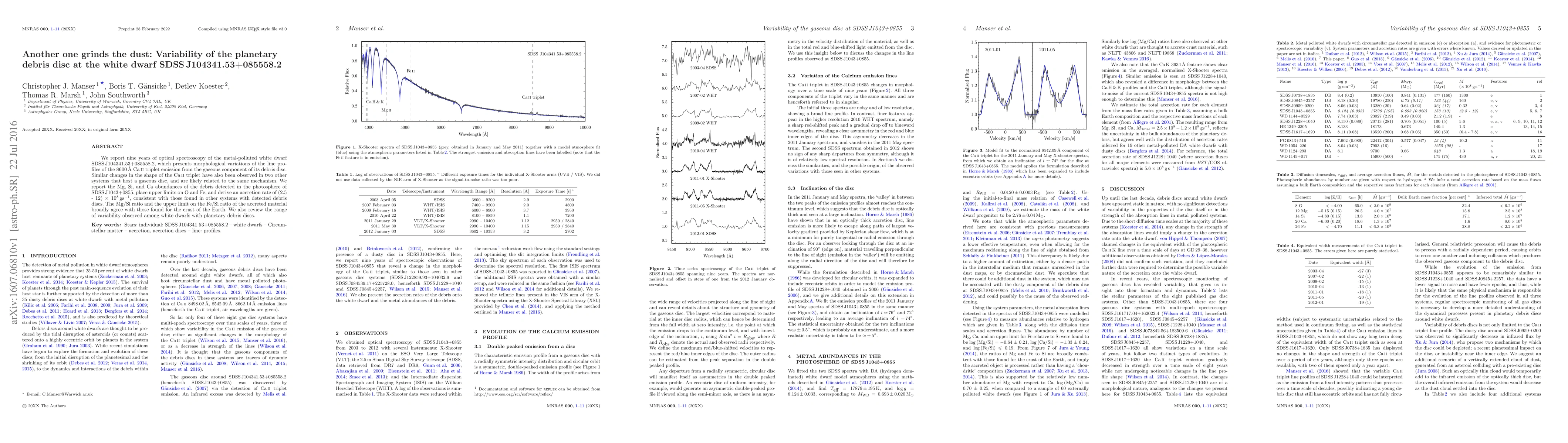 We report nine years of optical spectroscopy of the metal-polluted white dwarf SDSS J104341.53+085558.2, which presents morphological variations of the line profiles of the 8600 \AA\ Ca II triplet emission from the gaseous component of its debris disc. Similar changes in the shape of the Ca II triplet have also been observed in two other systems that host a gaseous disc, and are likely related to the same mechanism. We report the Mg, Si, and Ca abundances of the debris detected in the photosphere of SDSS J1043+0855, place upper limits on O and Fe, and derive an accretion rate of (2.5 - 12)x$10^8$ g/s, consistent with those found in other systems with detected debris discs. The Mg/Si ratio and the upper limit on the Fe/Si ratio of the accreted material broadly agree with those found for the crust of the Earth. We also review the range of variability observed among white dwarfs with planetary debris discs.