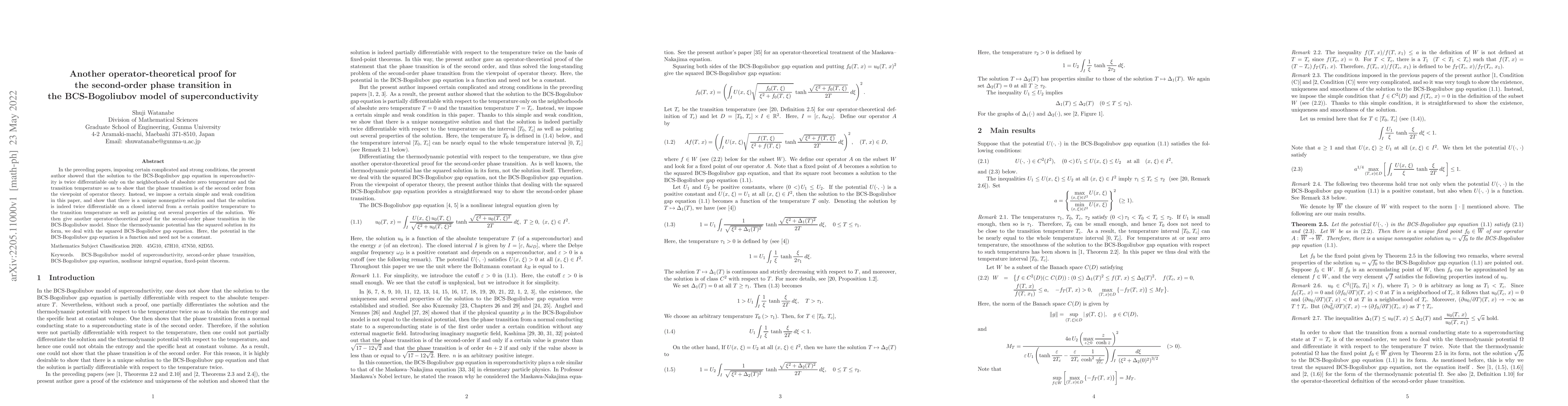 This paper provides a new operator-theoretical proof that the phase transition in superconductivity is of the second order, using a simpler condition than previously known, and showing that the solution to the BCS-Bogoliubov gap equation is twice differentiable on a closed interval above absolute zero.
