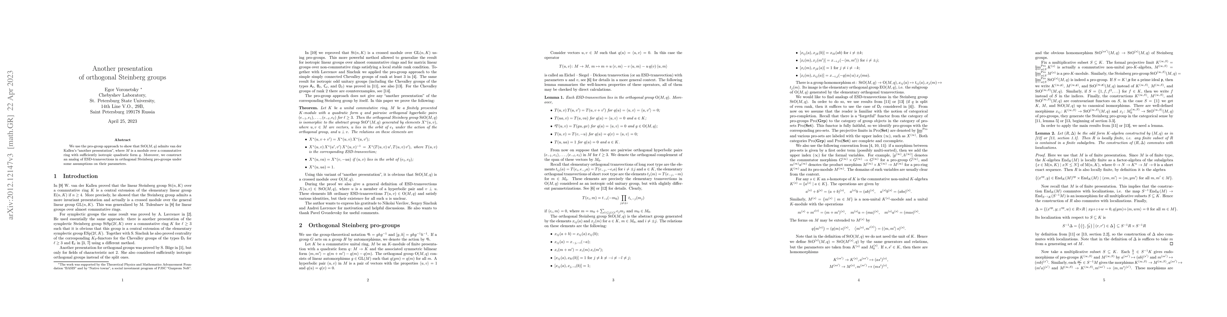 This paper demonstrates that orthogonal Steinberg groups $\mathrm{StO}(M, q)$ can be presented using van der Kallen's "another presentation" via a pro-group approach, and constructs an analogous ESD-transvection in these groups under specific conditions.