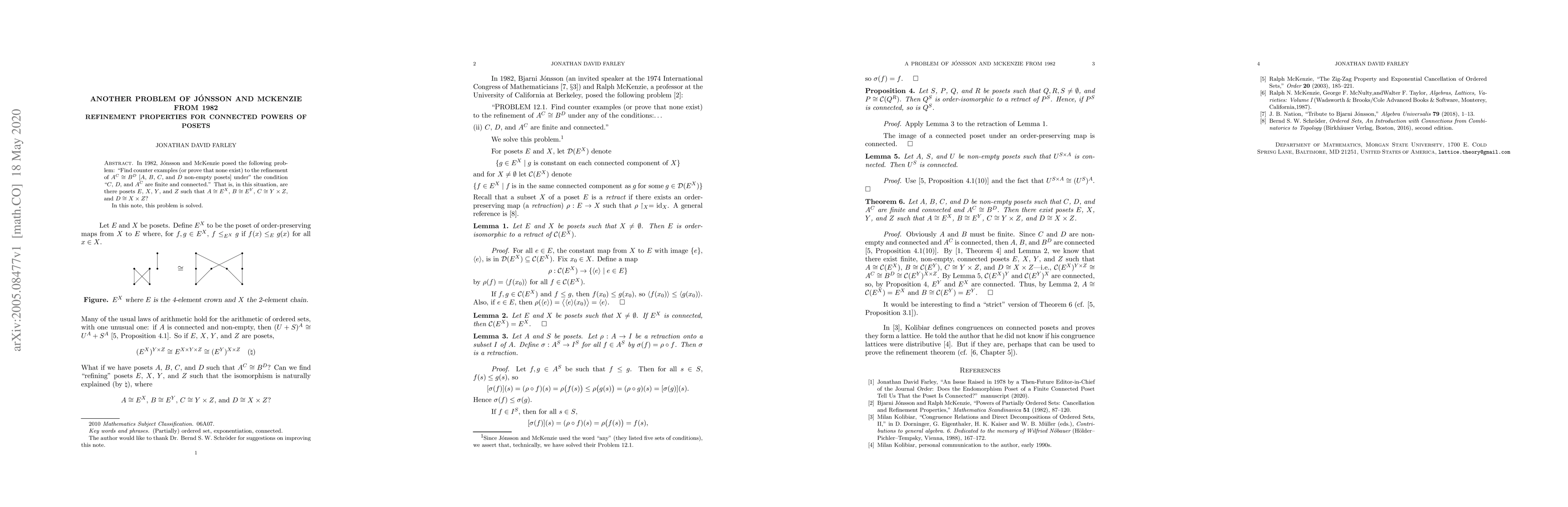 In 1982, J\'onsson and McKenzie posed the following problem: "Find counter examples (or prove that none exist) to the refinement of $A^C\cong B^D$ [$A$, $B$, $C$, and $D$ non-empty posets] under" the condition "$C$, $D$, and $A^C$ are finite and connected." That is, in this situation, are there posets $E$, $X$, $Y$, and $Z$ such that $A\cong E^X$, $B\cong E^Y$, $C\cong Y\times Z$, and $D\cong X\times Z$? In this note, this problem is solved.