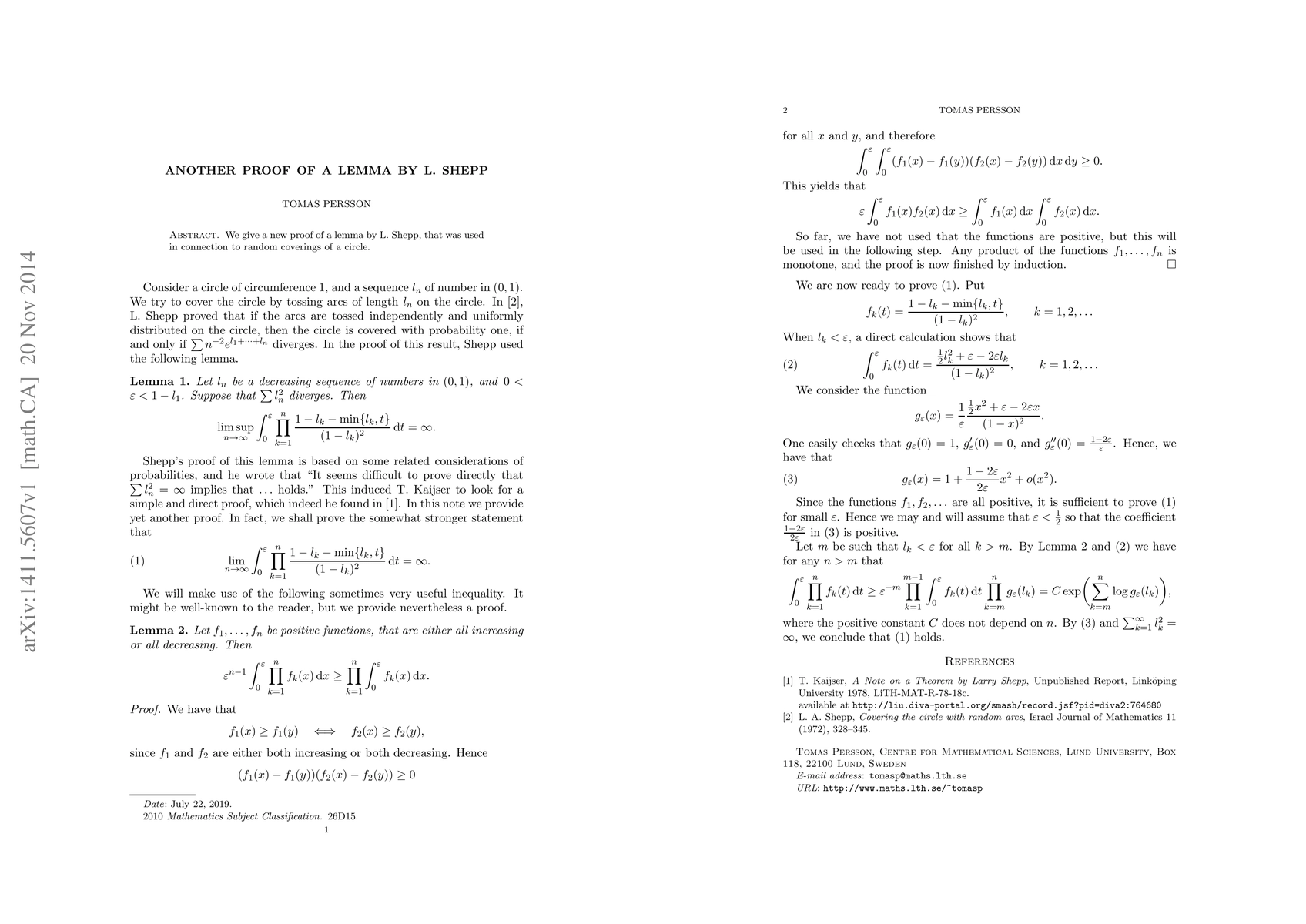 We give a new proof of a lemma by L. Shepp, that was used in connection to random coverings of a circle.