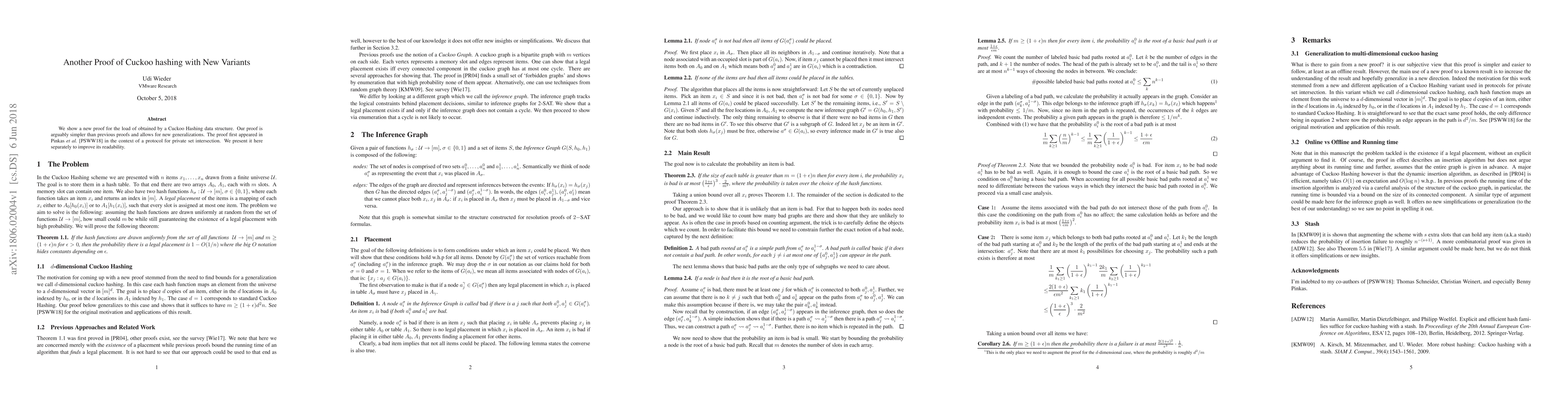 We show a new proof for the load of obtained by a Cuckoo Hashing data structure. Our proof is arguably simpler than previous proofs and allows for new generalizations. The proof first appeared in Pinkas et. al. \cite{PSWW19} in the context of a protocol for private set intersection. We present it here separately to improve its readability.