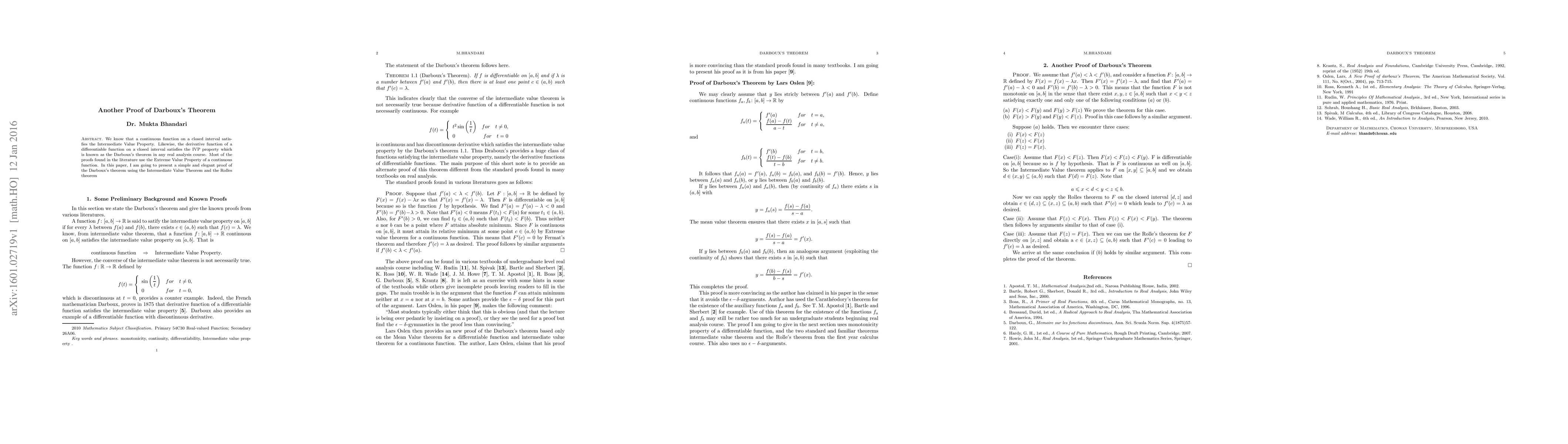 This paper presents a simple proof of Darboux's Theorem using the Intermediate Value Theorem and Rolle's theorem, providing an alternative to existing proofs that rely on the Extreme Value Property.