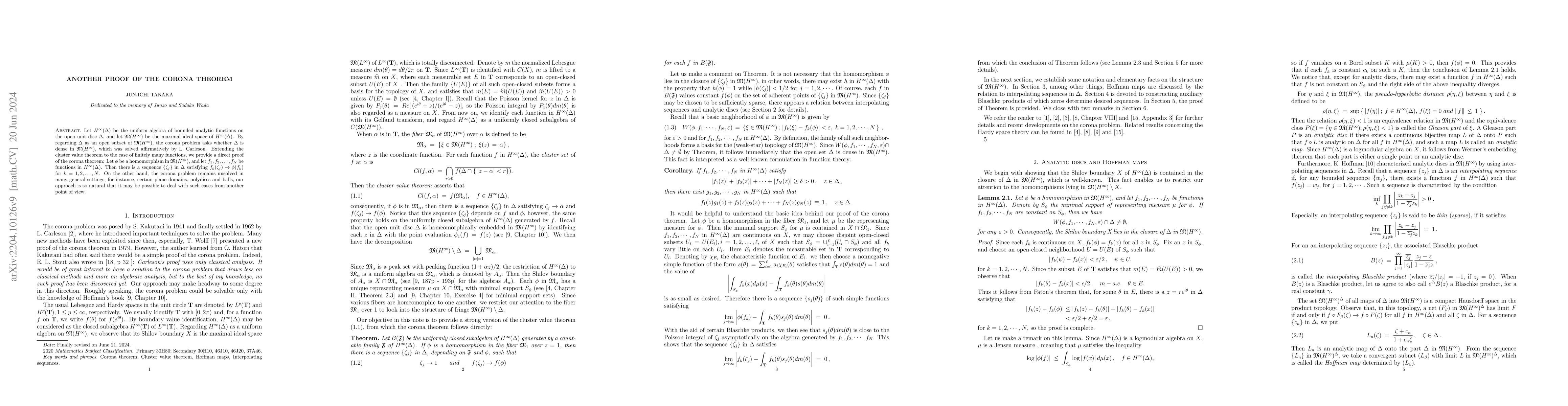 Let $H^\infty(\Delta)$ be the uniform algebra of bounded analytic functions on the open unit disc $\Delta$, and let $\mathfrak{M}(H^\infty)$ be the maximal ideal space of $H^\infty(\Delta)$. By regarding $\Delta$ as an open subset of $\mathfrak{M}(H^\infty)$, the corona problem asks whether $\Delta$ is dense in $\mathfrak{M}(H^\infty)$, which was solved affirmatively by L. Carleson. Extending the cluster value theorem to the case of finitely many functions, we provide a direct proof of the corona theorem: Let $\phi$ be a homomorphism in $\mathfrak{M}(H^\infty)$, and let $f_1, f_2, \dots, f_N$ be functions in $H^\infty(\Delta)$. Then there is a sequence $\{\zeta_j\}$ in $\Delta$ satisfying$f_k(\zeta_j) \rightarrow \phi(f_k)$ for $k=1, 2, \dots, N$. On the other hand, the corona problem remains unsolved in many general settings, for instance, certain plane domains, polydiscs and balls, our approach is so natural that it may be possible to deal with such cases from another point of view.