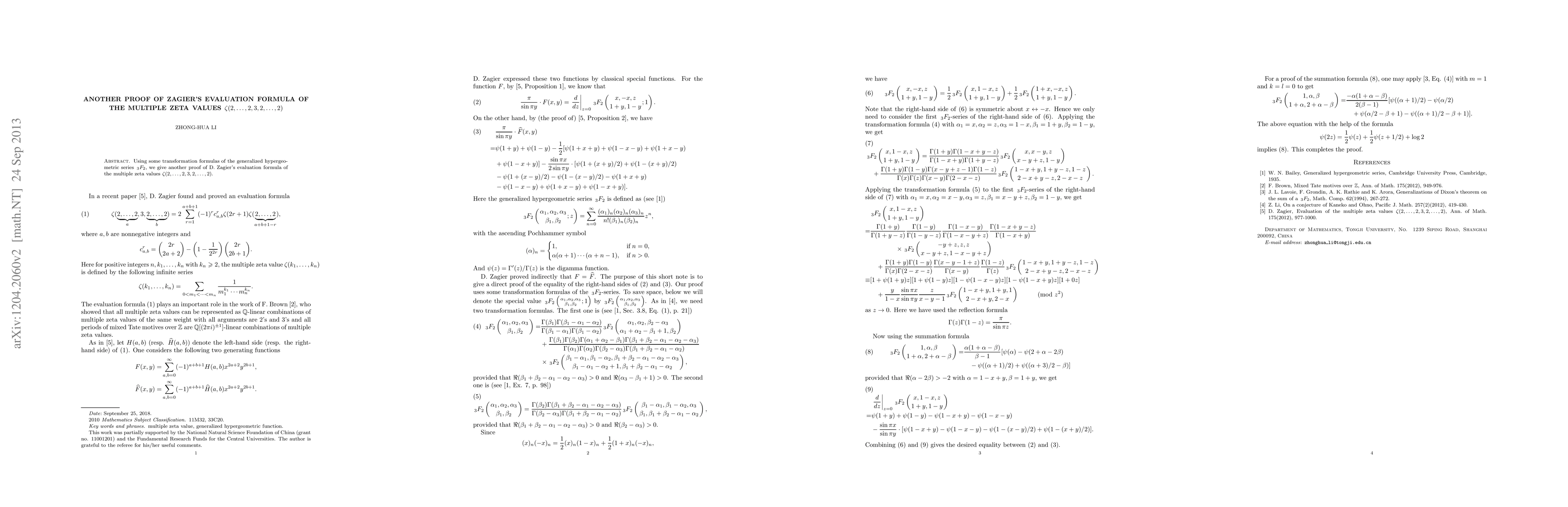 Using some transformation formulas of the generalized hypergeometric series $\,_3F_2$, we give another proof of D. Zagier's evaluation formula of the multiple zeta values $\zeta(2,...,2,3,2,...,2)$.