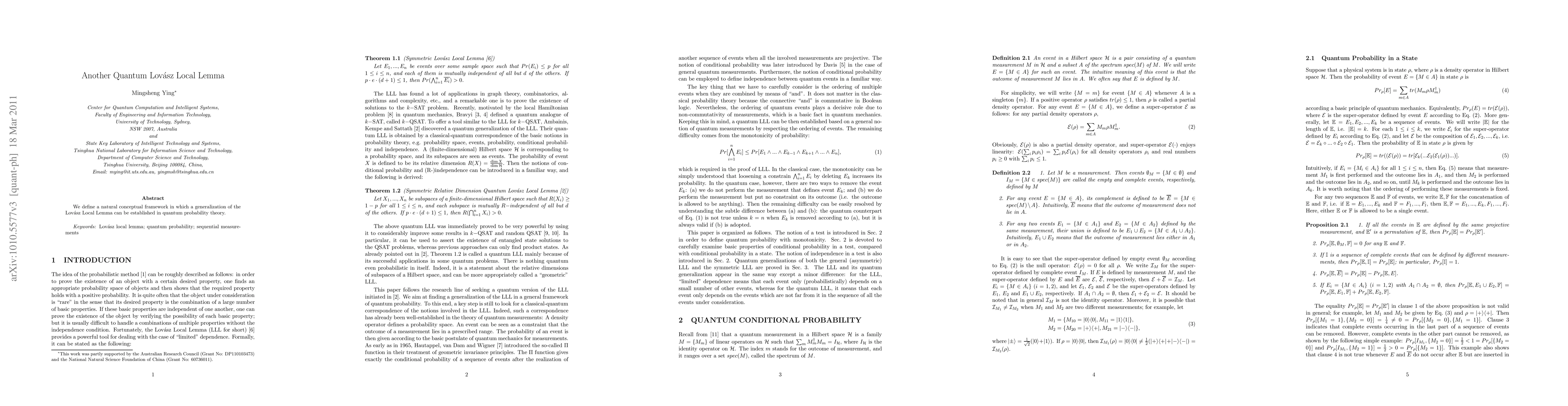 Summary: This paper introduces a conceptual framework for generalizing the classical Lovász Local Lemma to quantum probability theory, establishing a new quantum version of the lemma. The framework provides a foundation for probabilistic reasoning in quantum systems.