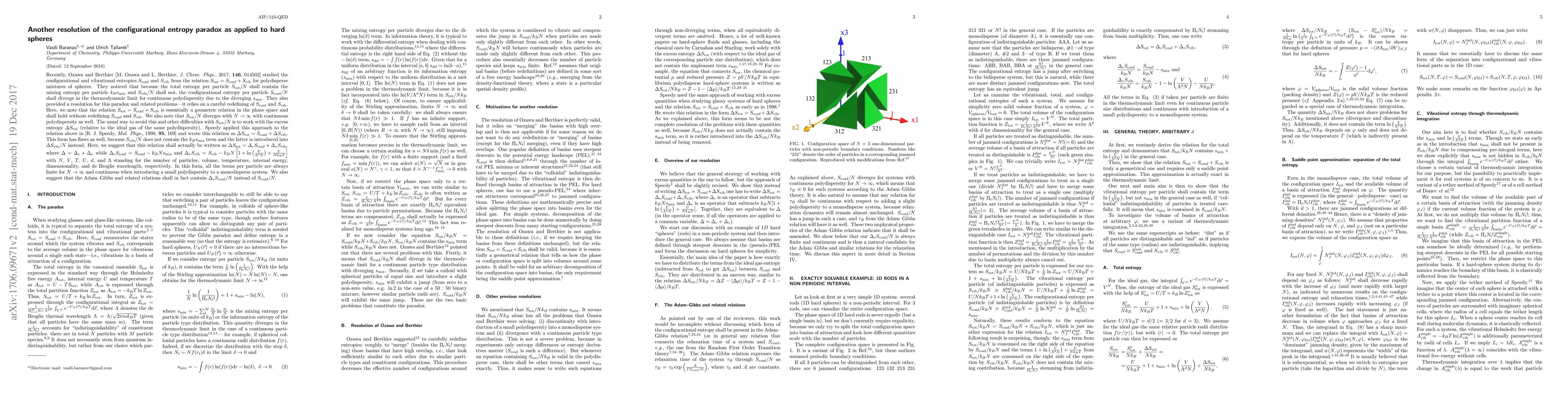 Researchers propose a new resolution to the configurational entropy paradox for hard spheres, suggesting that the total entropy per particle diverges in the thermodynamic limit due to continuous polydispersity, and offering an alternative way to express excess entropy using a new form of the relation.