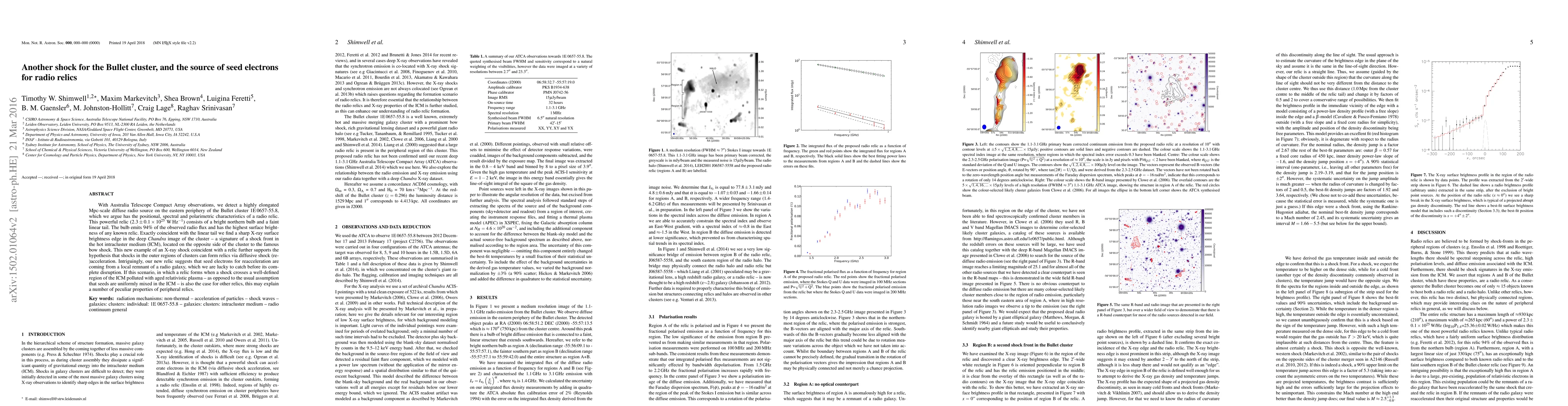 The study, using Australia Telescope Compact Array, discovers a potent, elongated radio source near the Bullet Cluster, identified as a radio relic. This relic, with unprecedented brightness, is linked to an X-ray shock front, suggesting seed electrons originate from a disintegrating radio galaxy. This finding supports the hypothesis that shocks in cluster outskirts create relics via re-acceleration, potentially explaining peculiarities of peripheral relics.